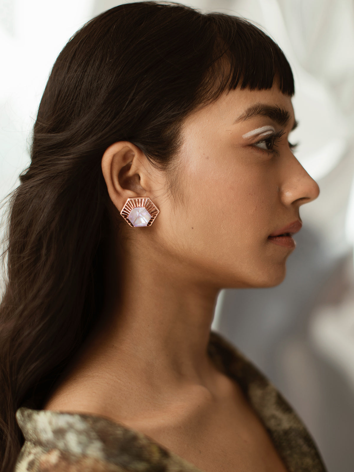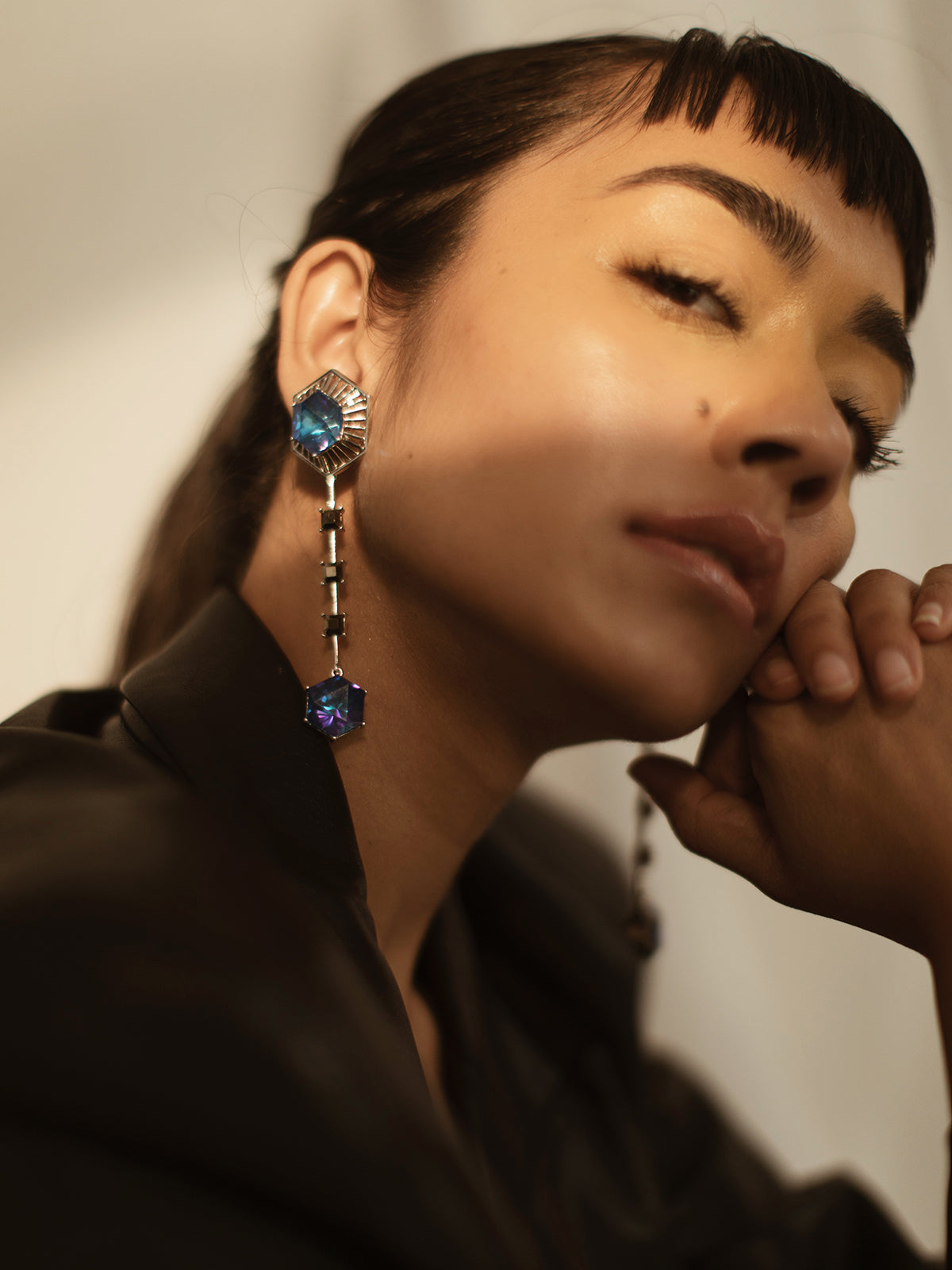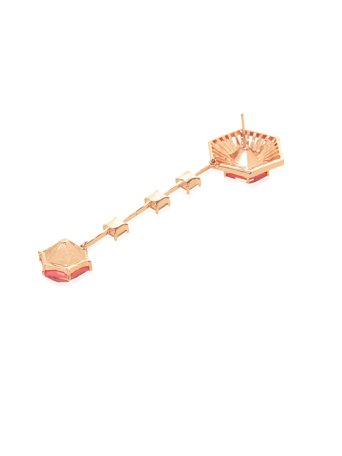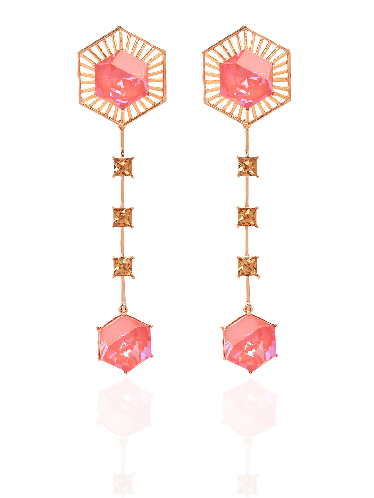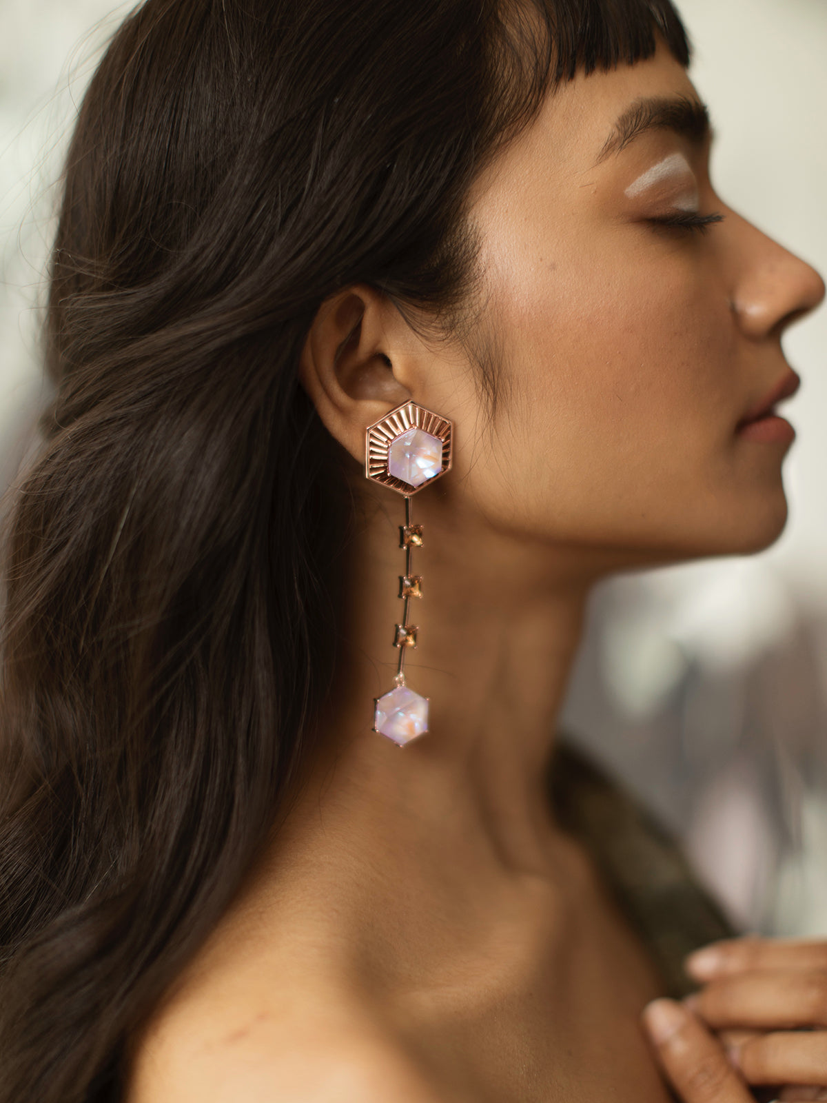 Detachable hanging studed with pink hexagon swarovski and smoky quartz squares - worn with the jacket as a hanging or as an earstud without