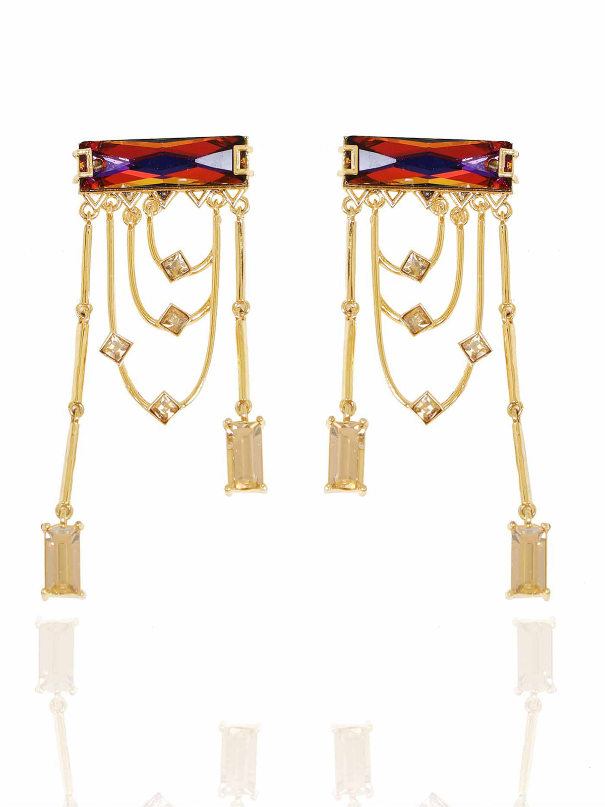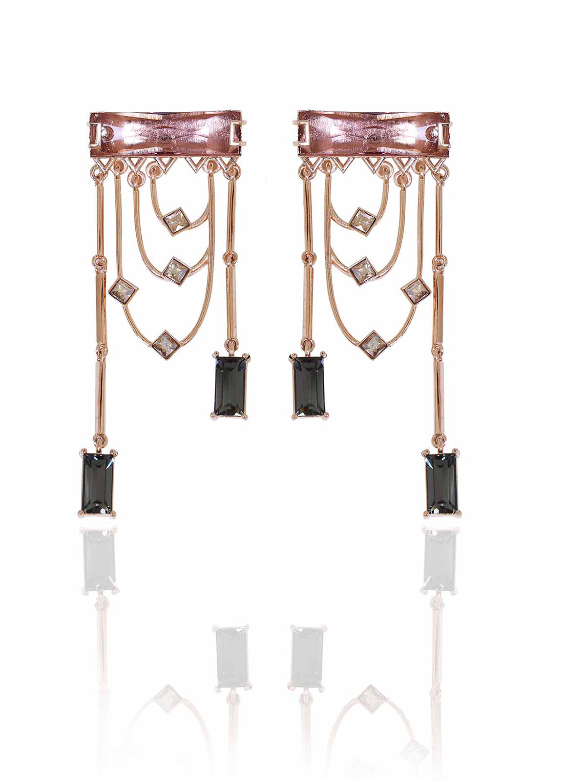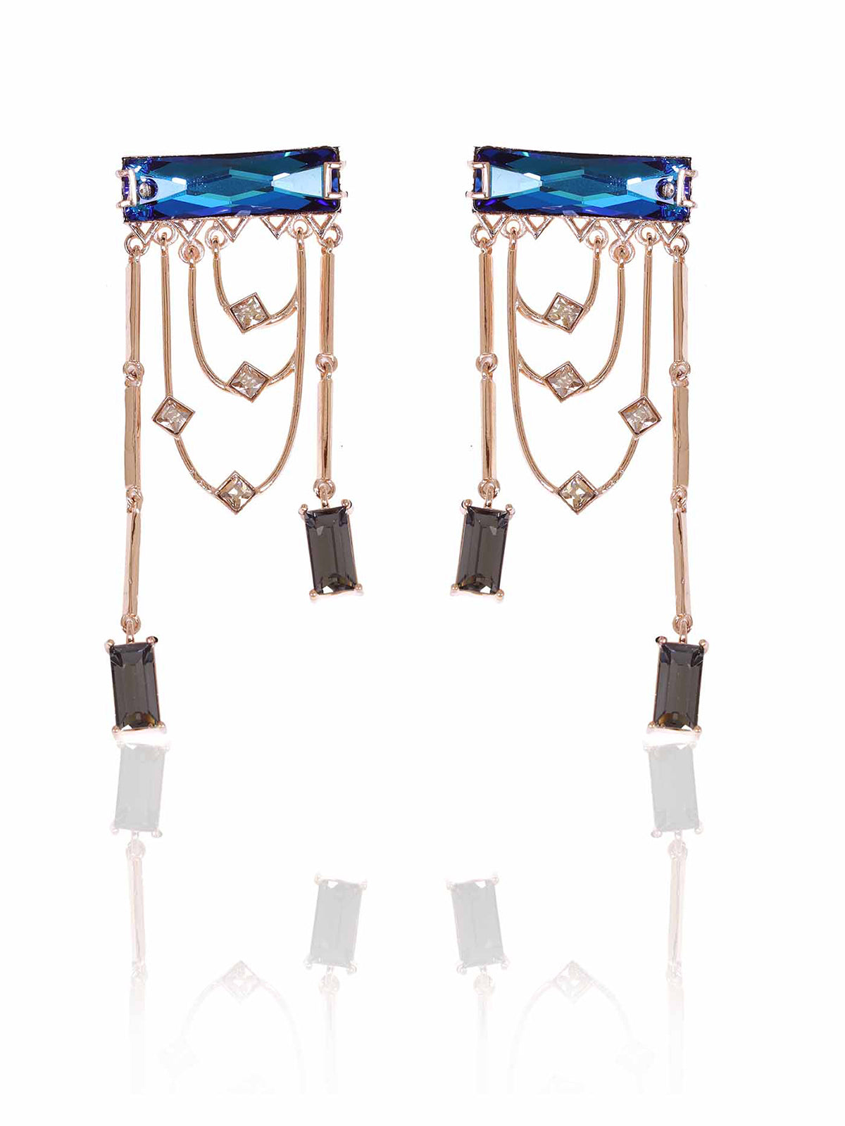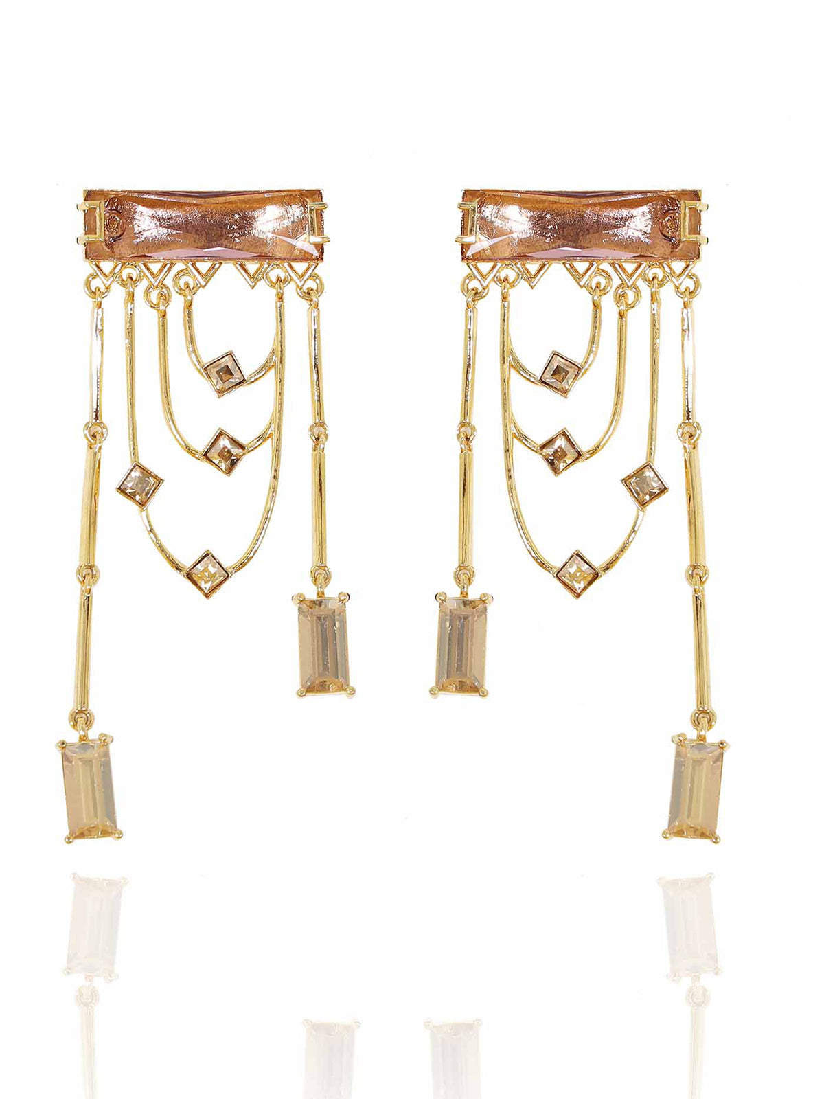 Magnificent dangler earrings adorned with a fancy cut princess Swarovski Baguette and sparkling golden shadow crystals. The earring dangles and sways with each and every movement.