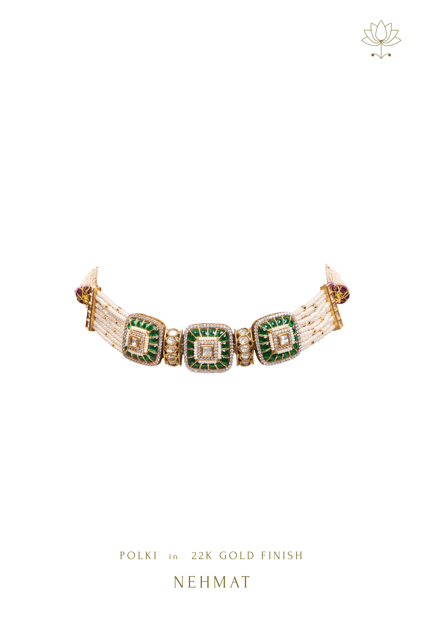 A statement emerald Polki choker handcrafted in an alloy of copper and brass, this piece features three intricately designed square motifs adorned with uncut Polki stones and bordered with deep green enamel. The strands of delicate white beads add a regal touch, making it perfect for festive and bridal occasions.
