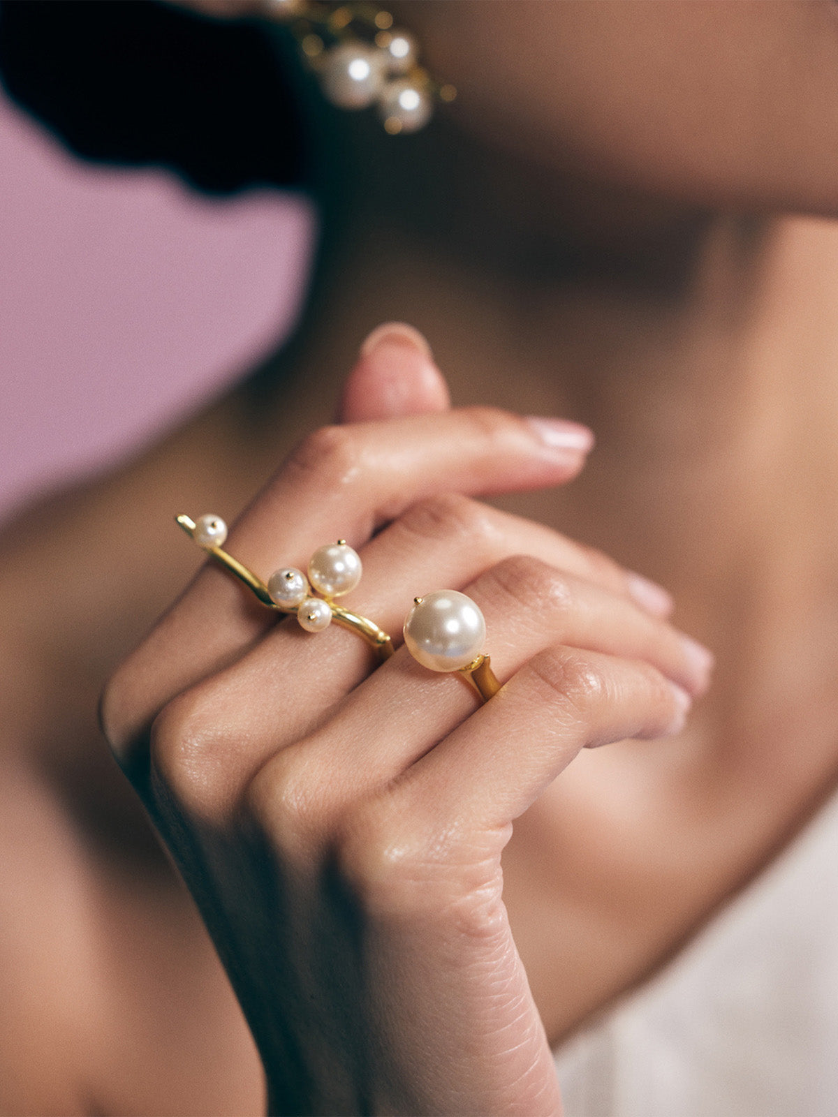 Rosée de café (meaning "Dew on Coffee") draws its inspiration from the coffee plantations in Coorg. It features glistening pearls and intricate gold designs abstracting the form of coffee berries. This collection is well suited for occasions demanding elaborate designs but where you don’t want to go with the commonplace!