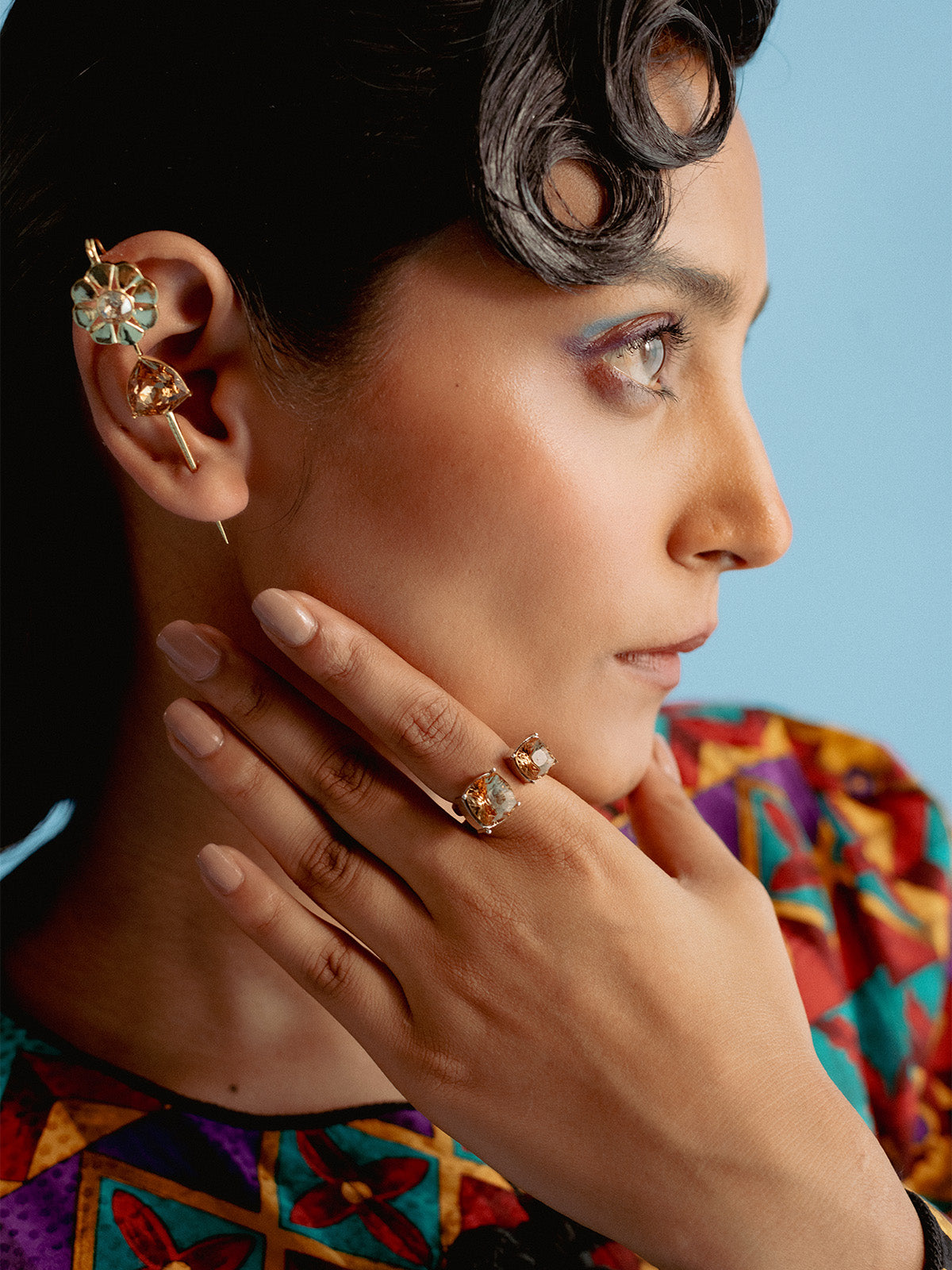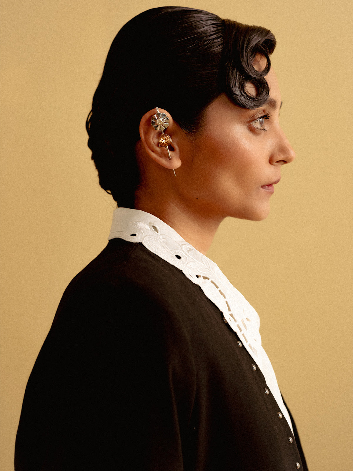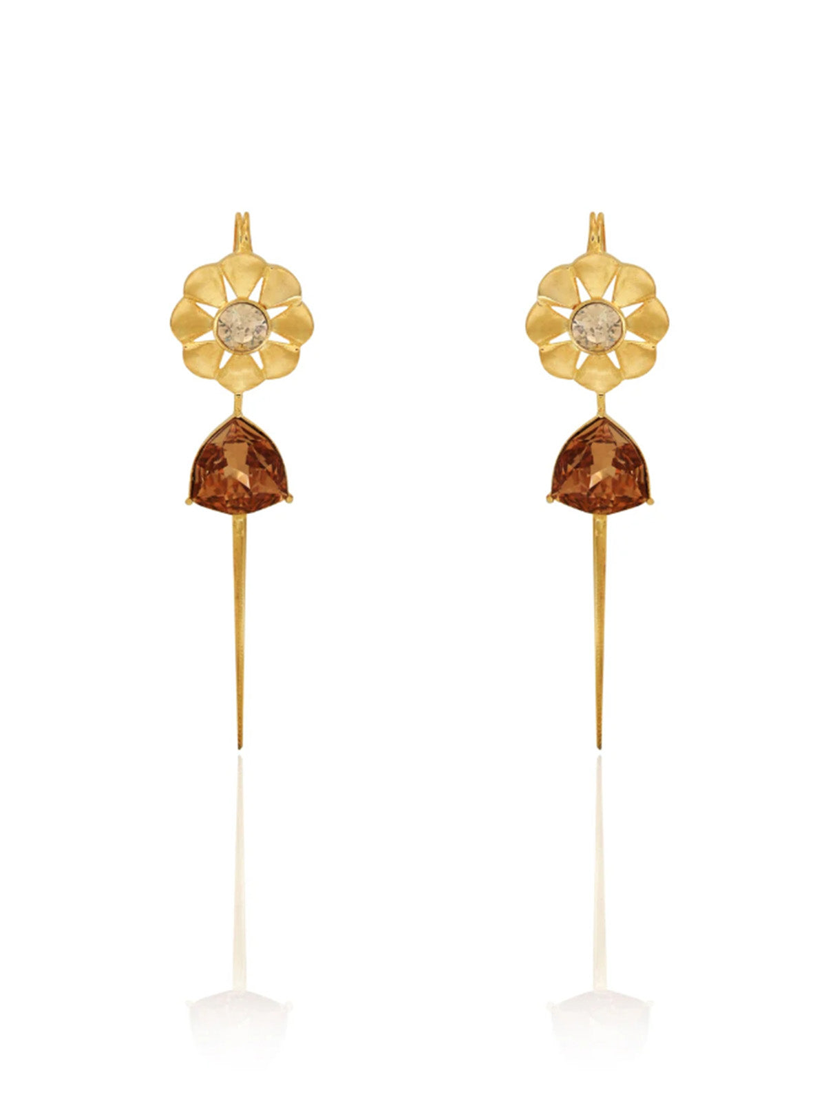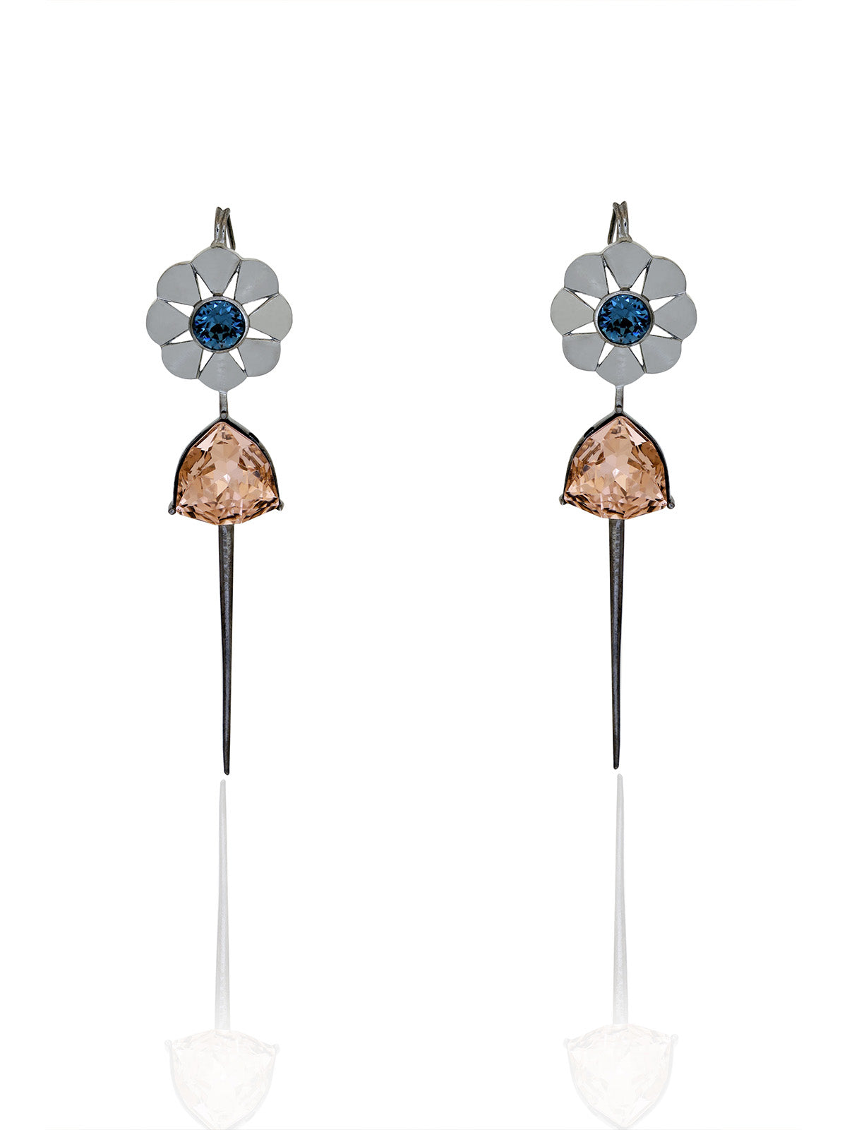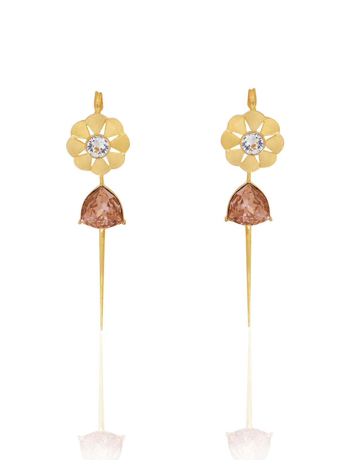 The Vintage Lily is a pair of needle style earrings adorned with soft floral motifs and trillion cut shimmering Swarovski crystals that take you back to bygone eras.
