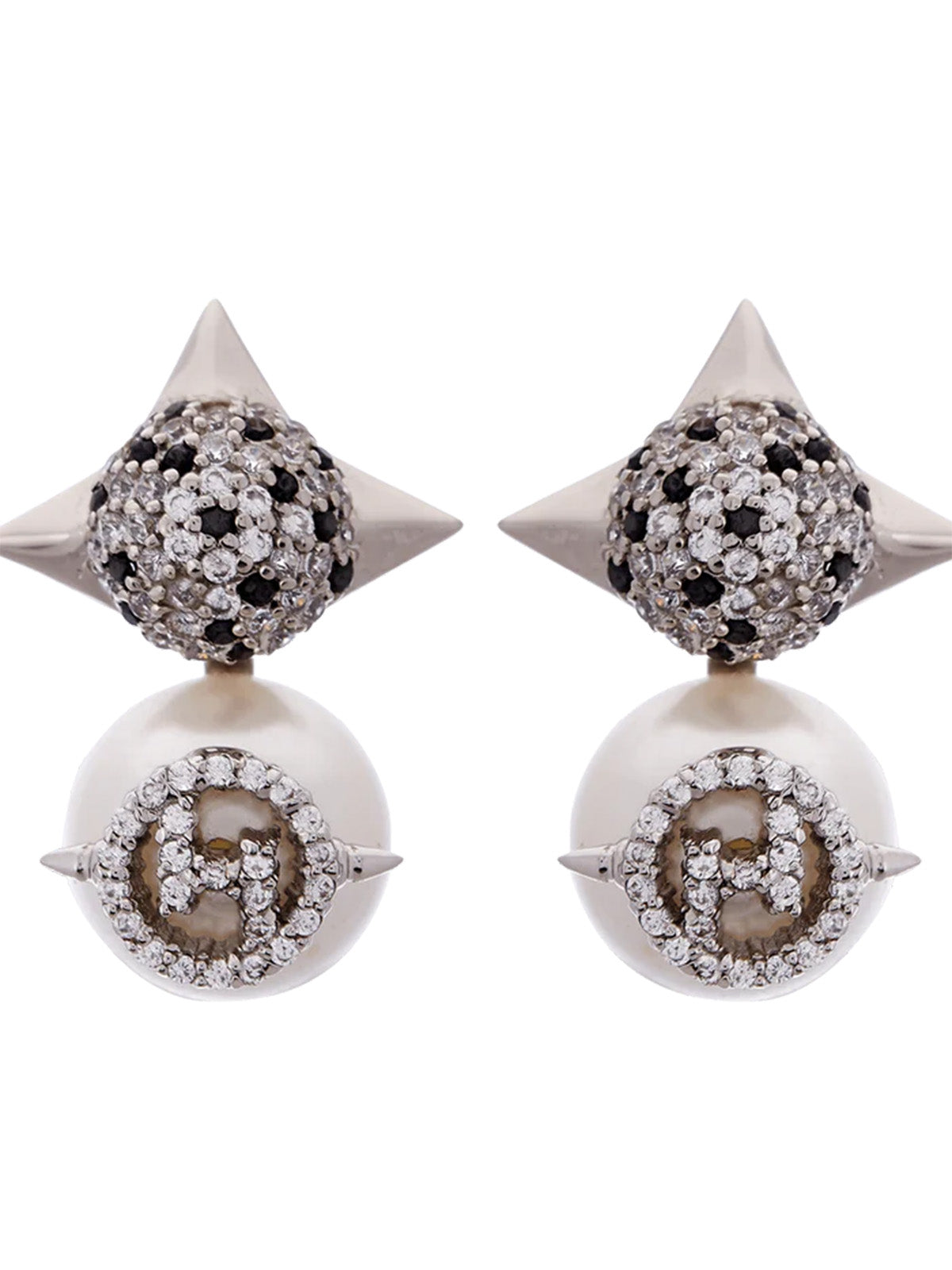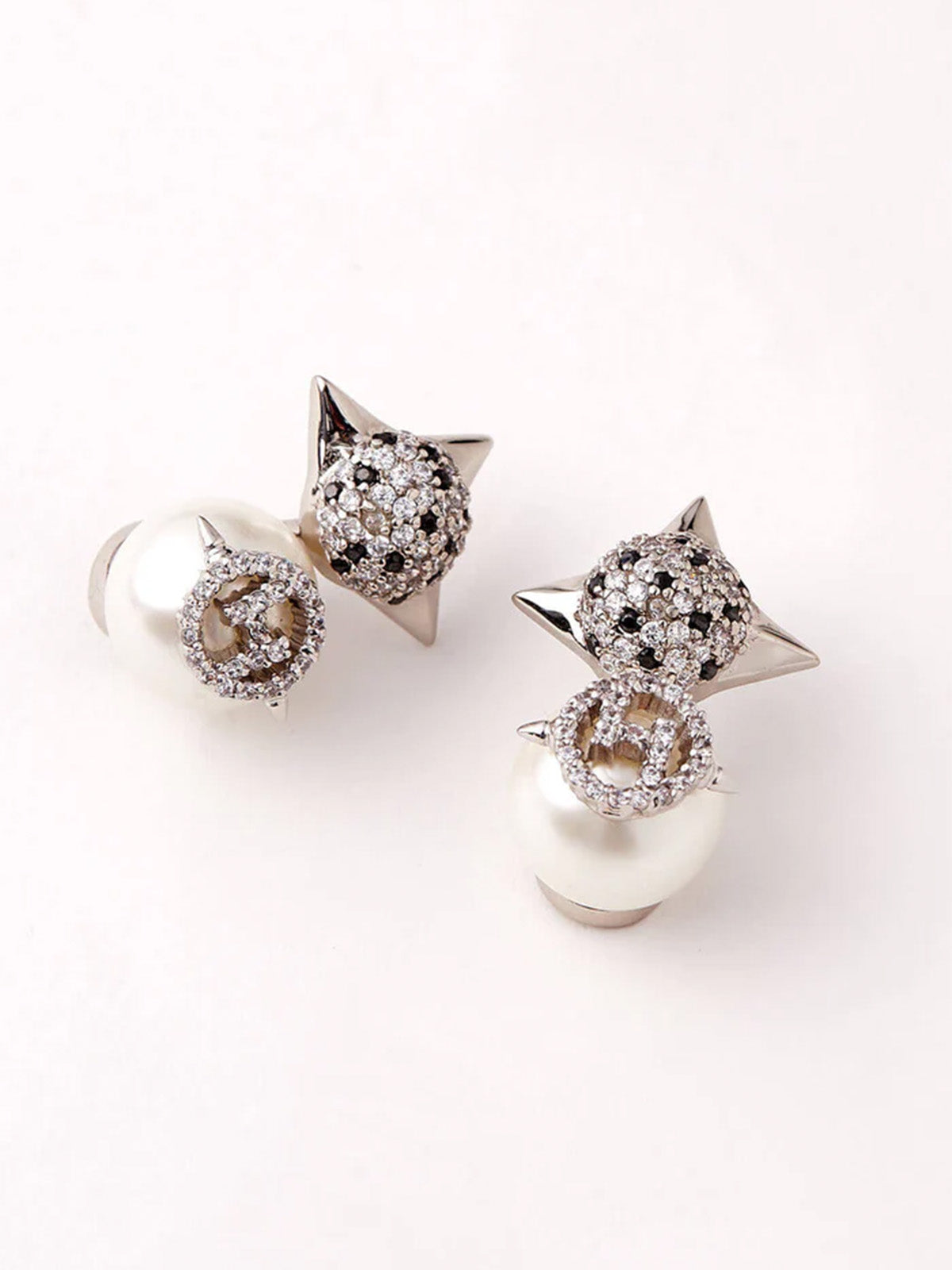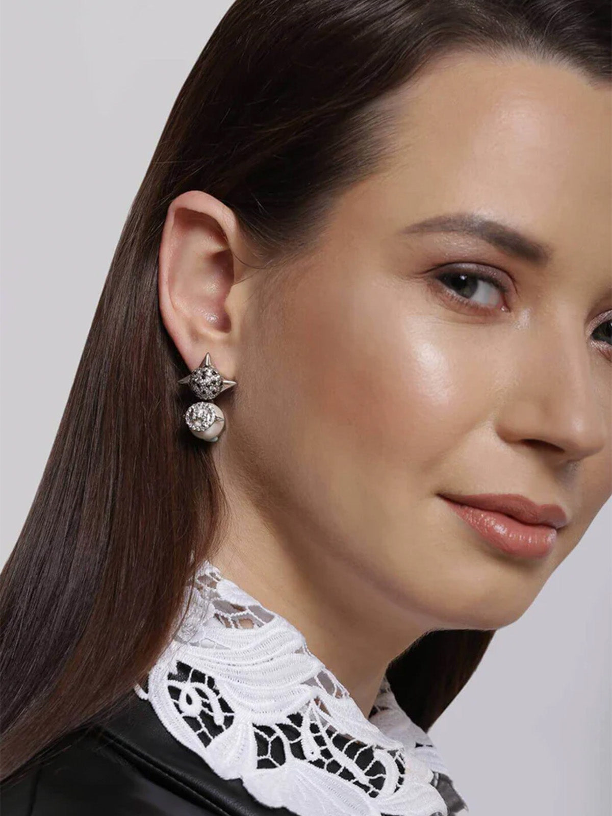 The Scorpia Nova Studs are eclectic and chic - the incandescent crystals meet with an elegant ivory pearl in these designer stud earrings; with a lavish 22K Silver finish to create a look that's mystical and alluring.