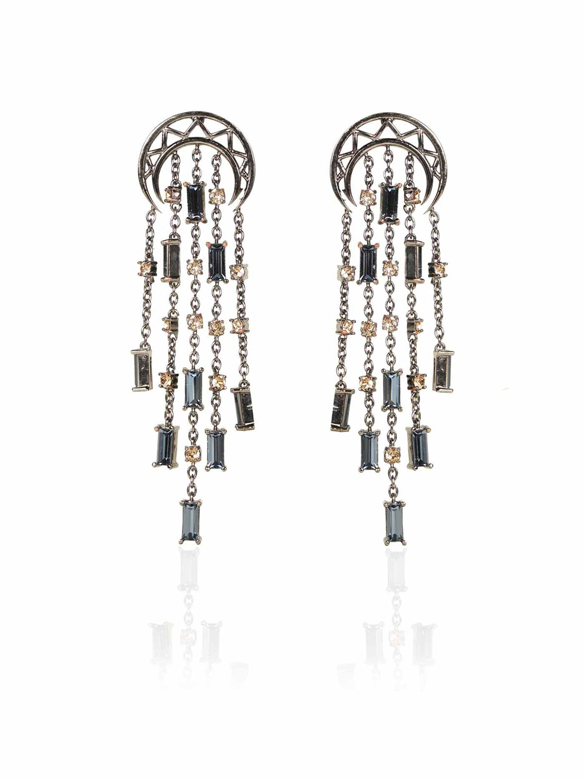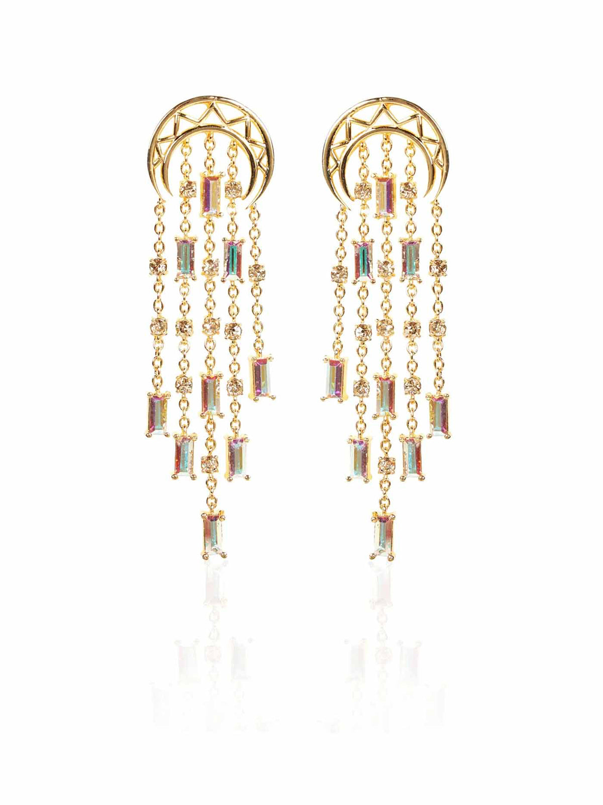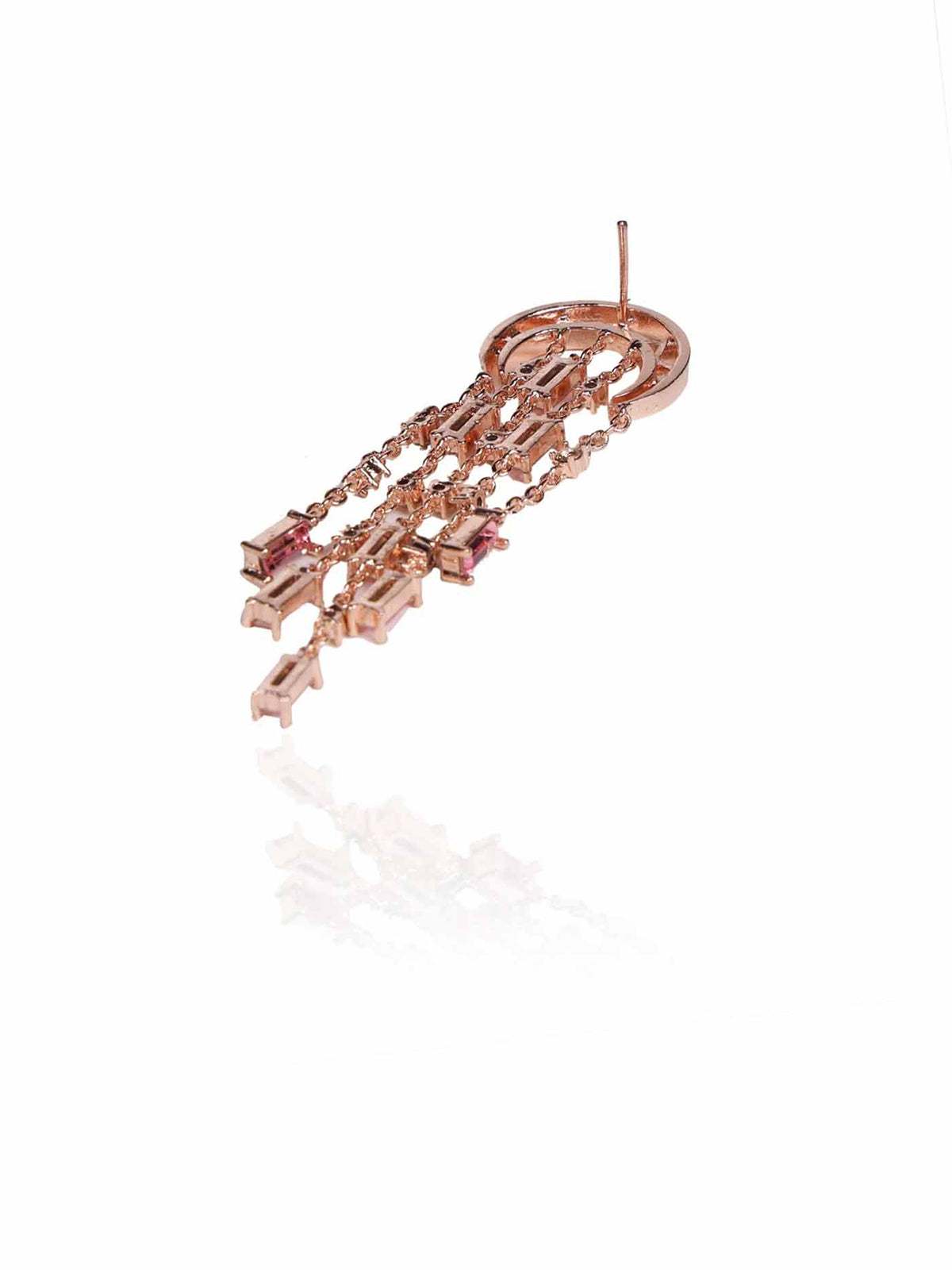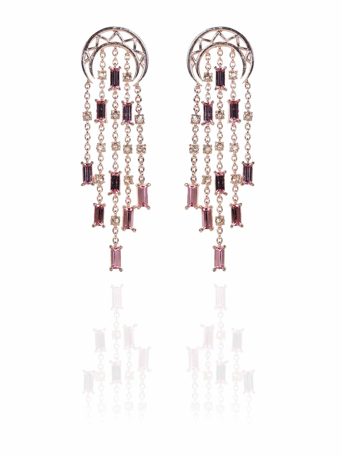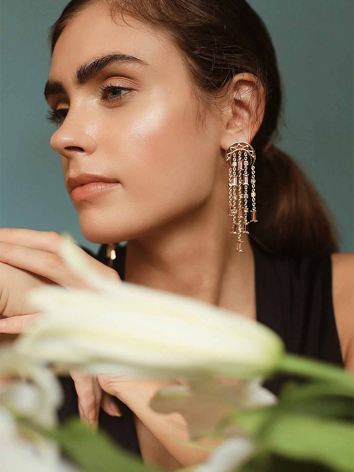 This glomourous pair of danglers inspired from the dance form Rumba will make a statement in every occasion. Sculpted in a beautiful horse shoe cut work these danglers are adorned with sparkling swarovski baguettes. These earrings are elegant yet statement.