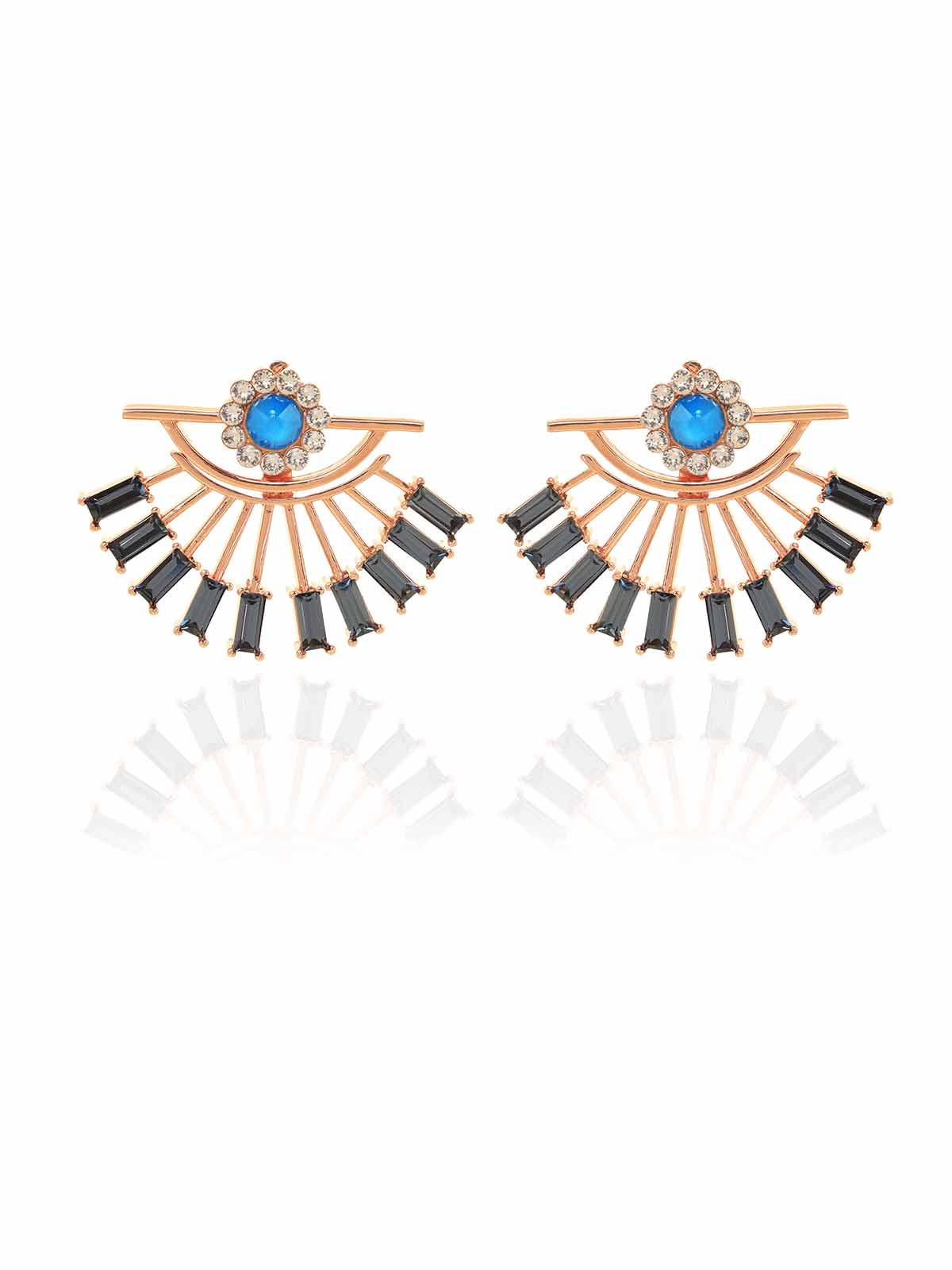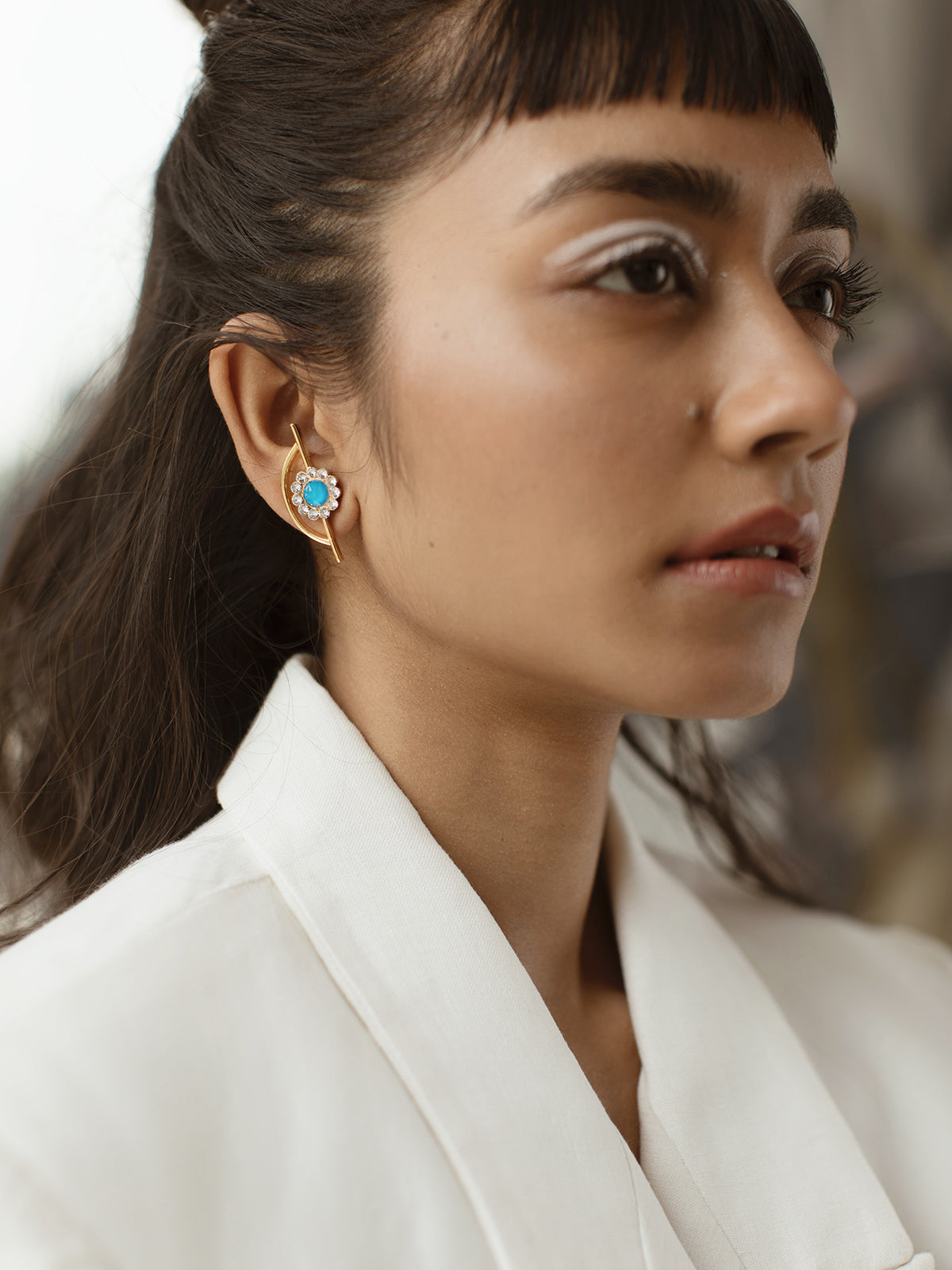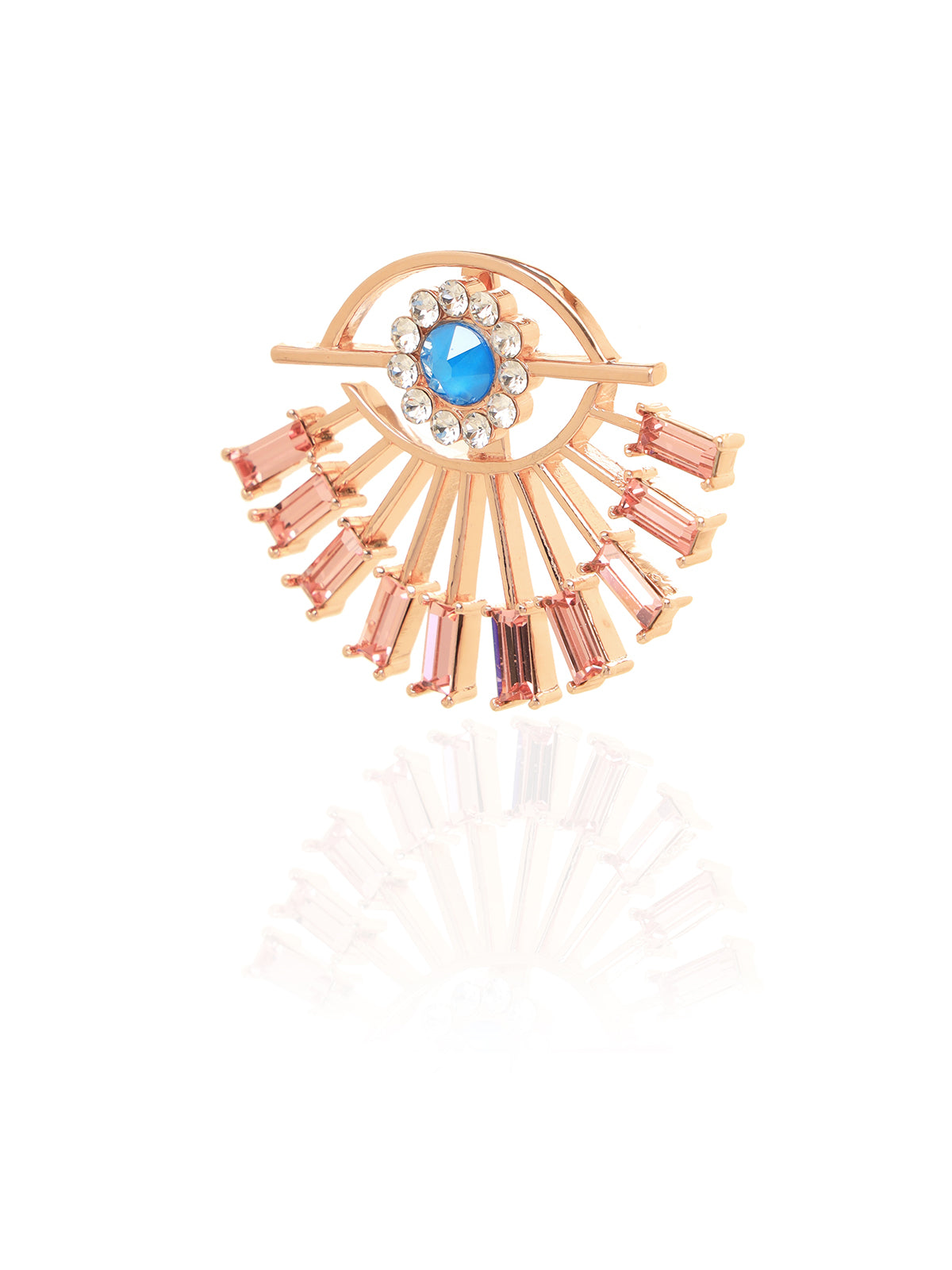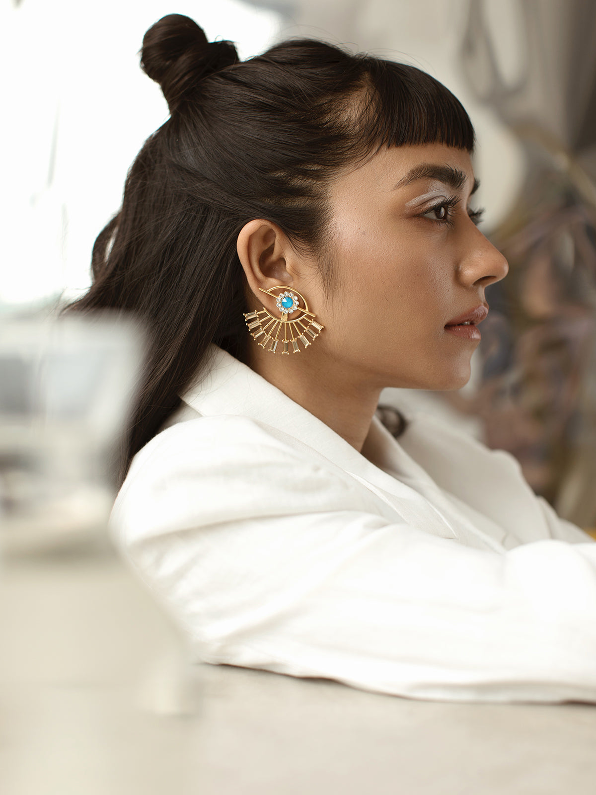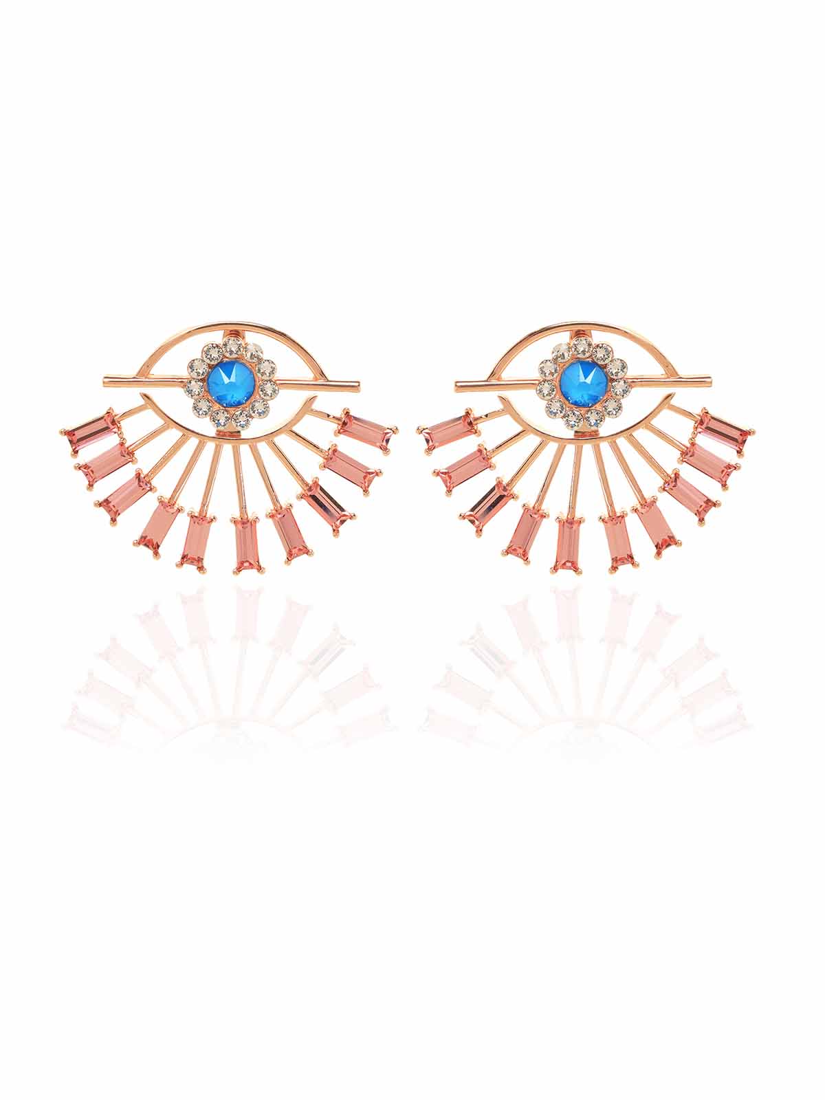 Detachable evil eye earrings studded with a blue round swarovski and rose pink baguettes- worn without the jacket as an earstud or with as a hanging