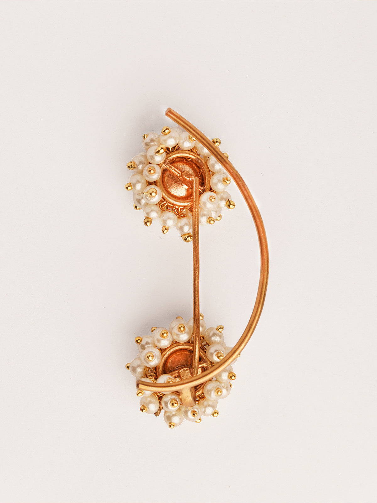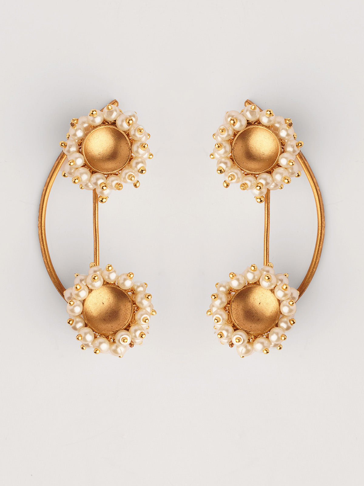 Earrings that smartly become the double earring ,perfect to make your friends do a double take ! Wear it with your jeans and jackets or your kurtas and saris. Wear it to a date or to a haldi. It's just perfect. Tiny pearls have been hand strung in 22k gold plated metal and styled into stunning bunches.