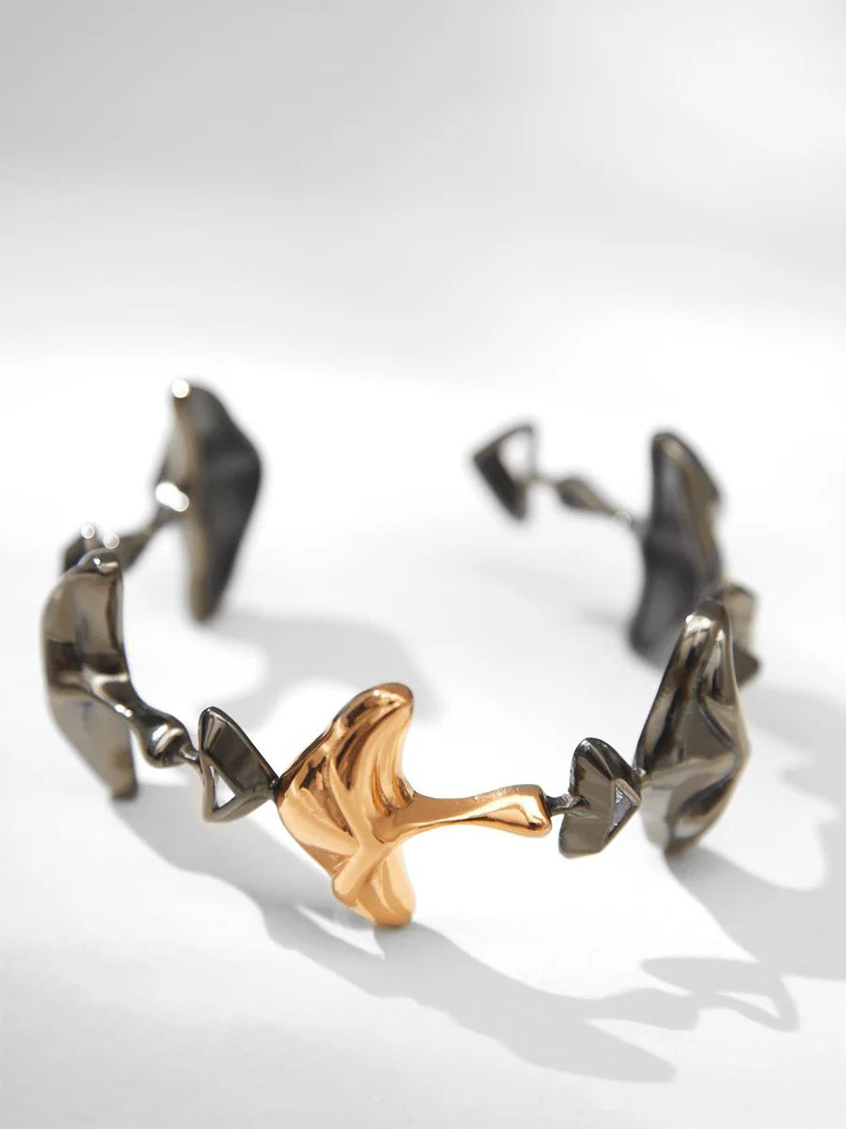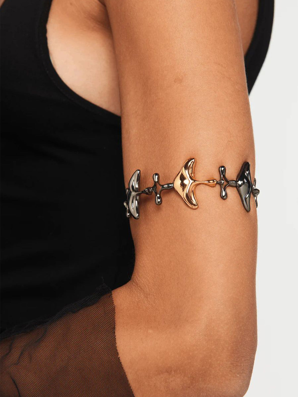 The Shroomhead bangle in dual tone finish is a versatile piece created in 22 KT gunmetal plating, that will effortlessly take the centerstage in any outfit. With a keen attention to detail, the creation is elevated with gold highlights that seamlessly blend with the design. Designed to uplift the entire look, the bracelet features the new motif of the House in a contemporary version, promising an individualistic look through its refined artistry.