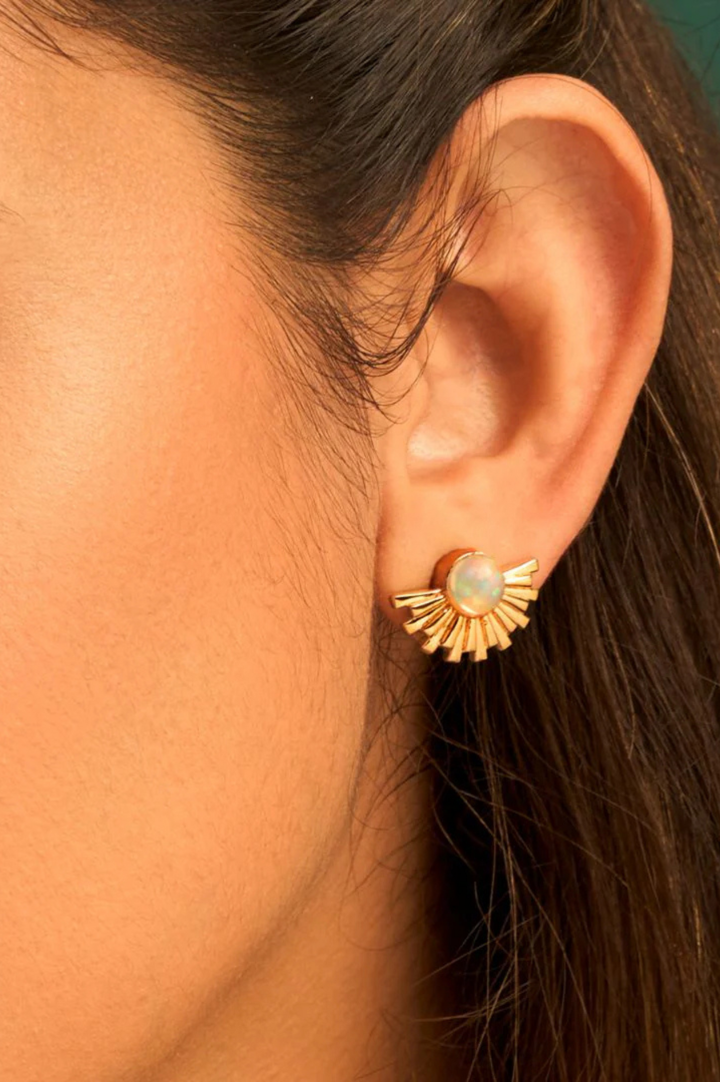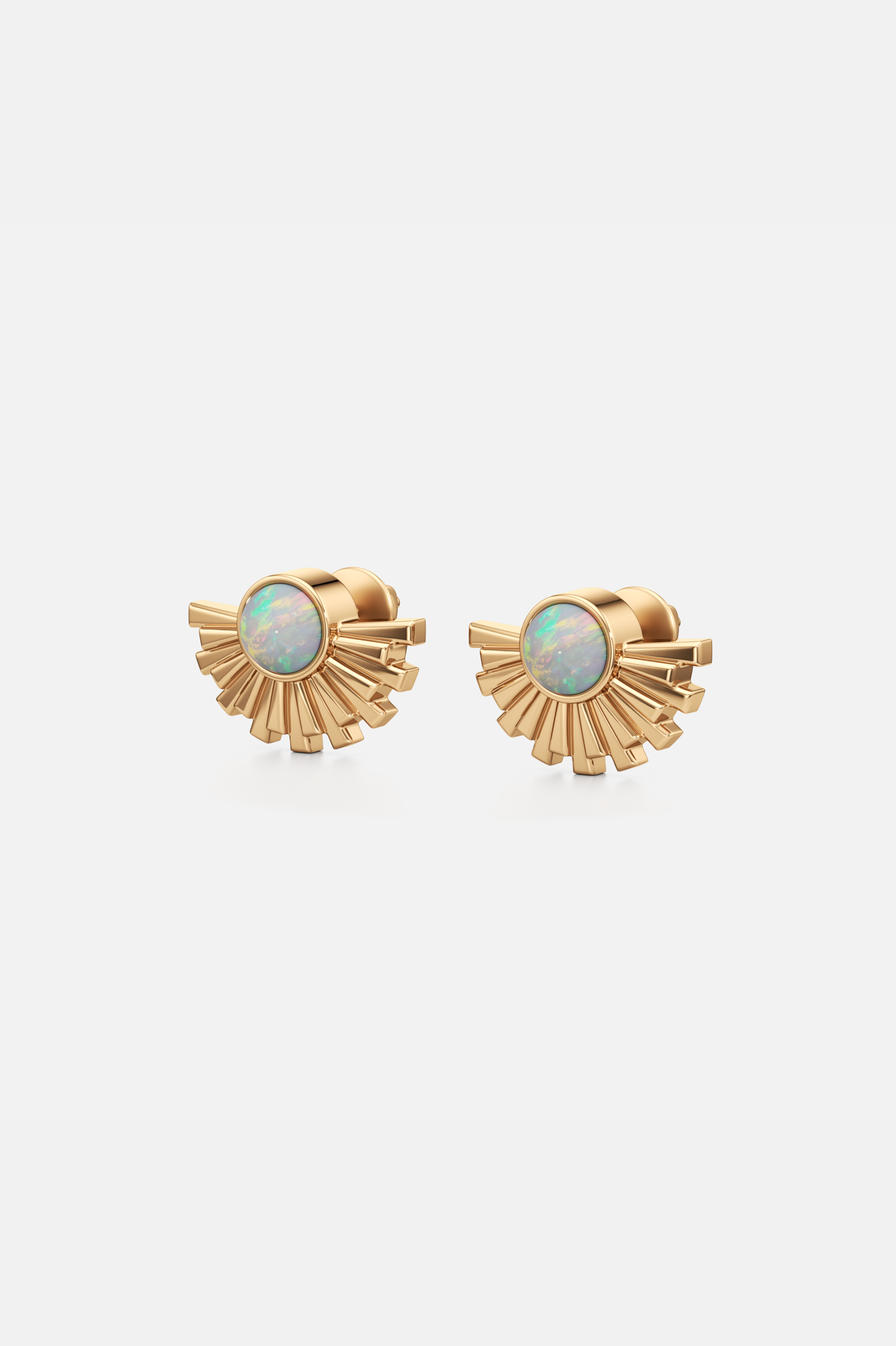 Indulge in the allure of our Solaris Opal Earrings. Each earring features an opal stone in a half sun-inspired design, radiating warmth and elegance.