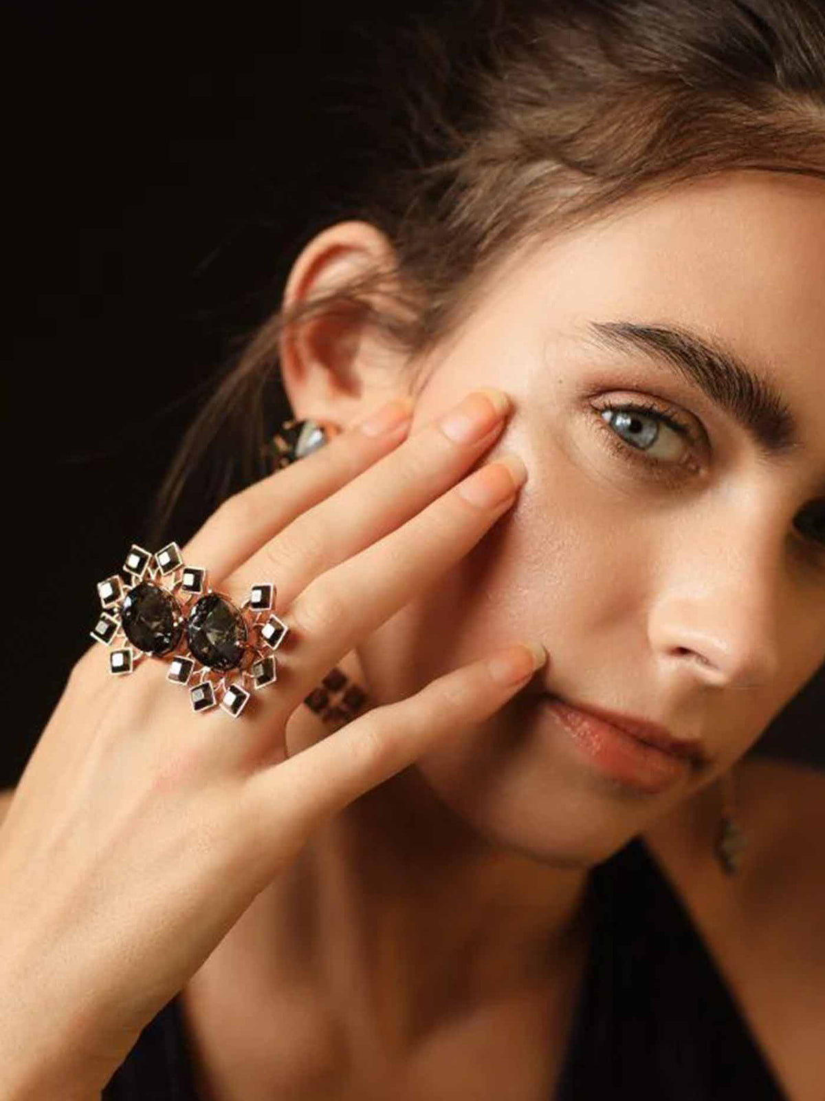 Sway away to the rhythm of life filled with joy and sorrow. Drawing inspiration from the same rhythmic flare, featuring a statement ring with a reflective black swarovski crsytal adorning the centre.