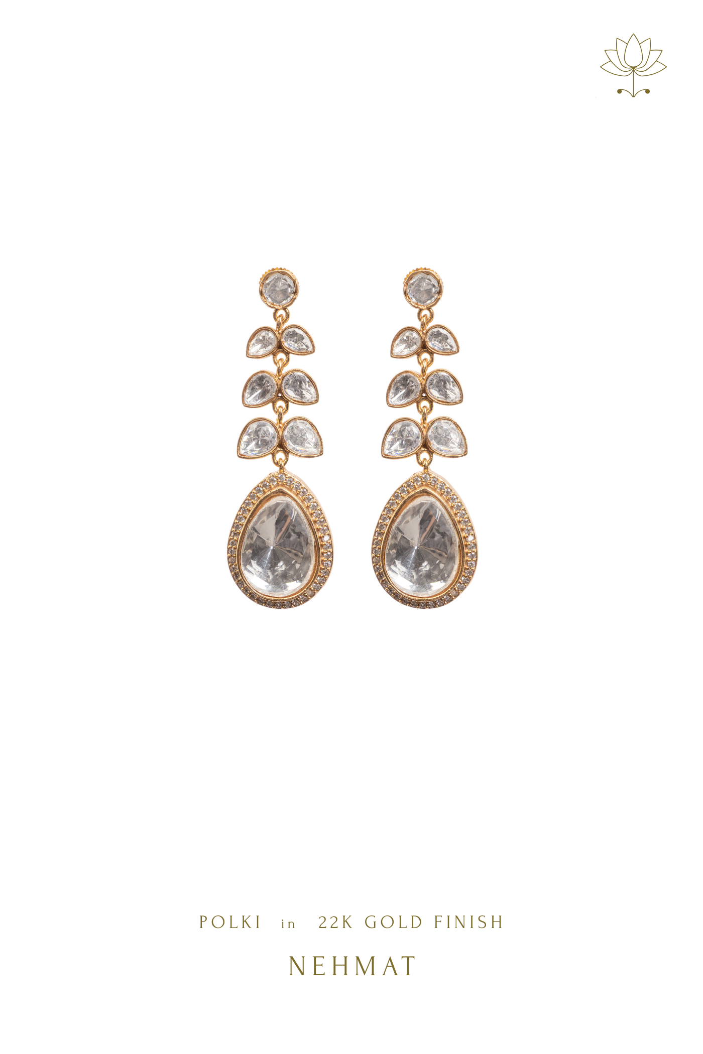 Timeless and luminous, The Ira Drops feature a striking teardrop Polki framed in delicate Zirconia halos — an ode to minimal grandeur. Crafted in a polished copper-brass alloy, these earrings blend heritage artistry with modern grace, perfect for moments that call for understated opulence.