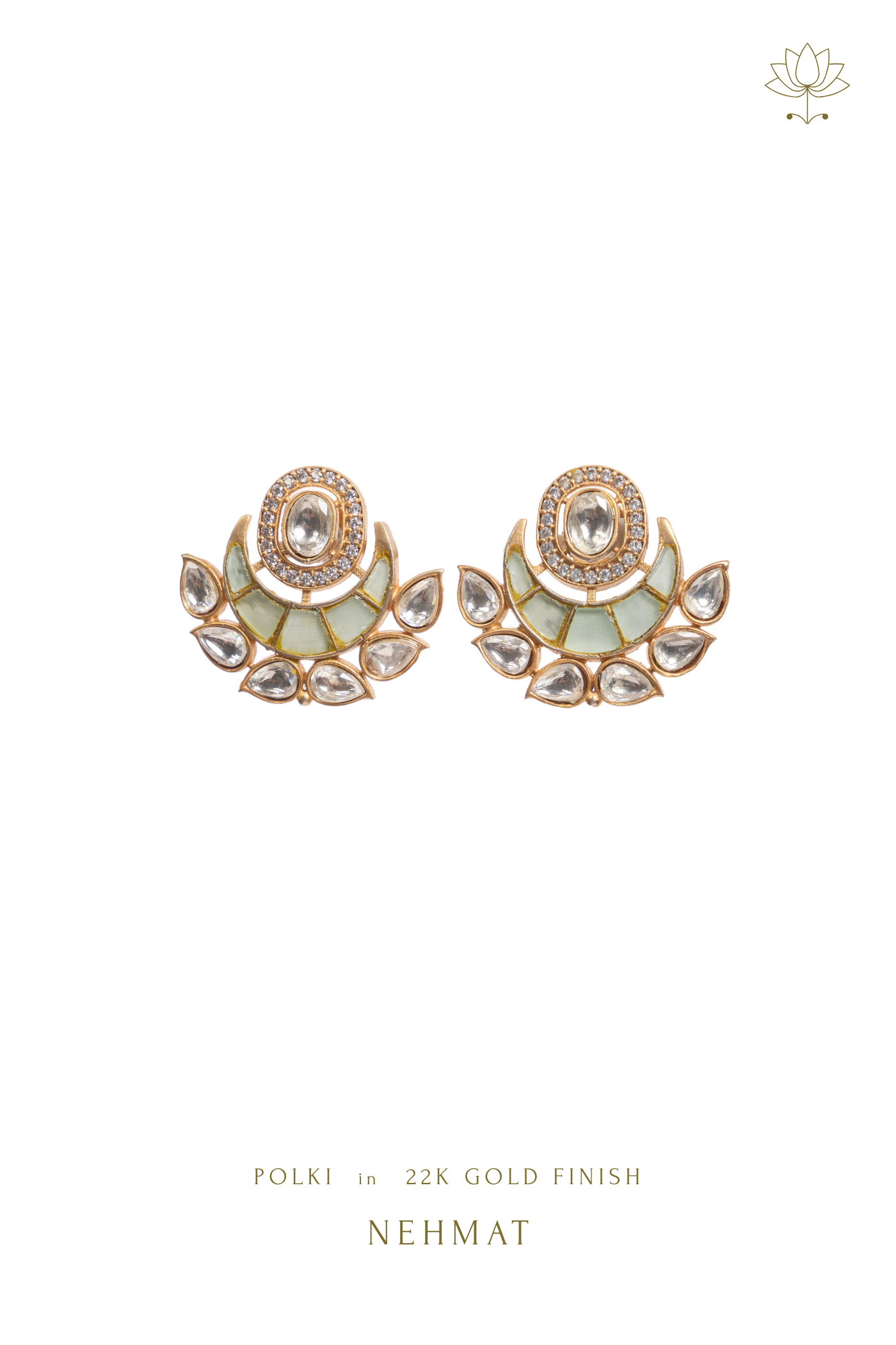 A poetic play of symmetry and shine, The Myra Crescent Studs reimagine traditional Polki with a sculptural twist. The luminous half-moon design, handcrafted in gold-plated copper and brass, glows softly against the skin — a quiet statement of grace and heritage.