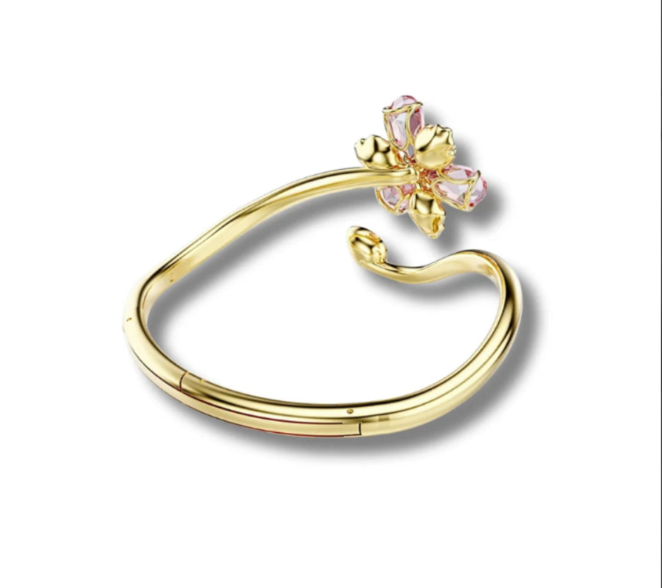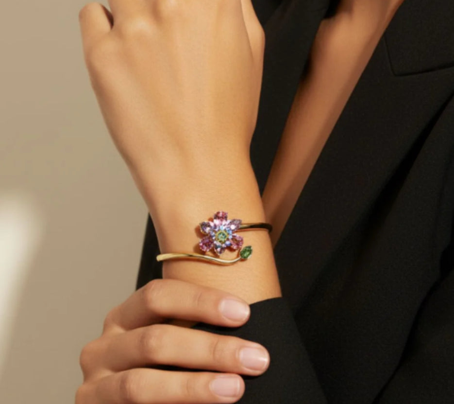 A radiant floral cluster of pink and green Swarovski crystals blooms at one end, while a single vivid green stone crowns the fluid gold arc at the other.