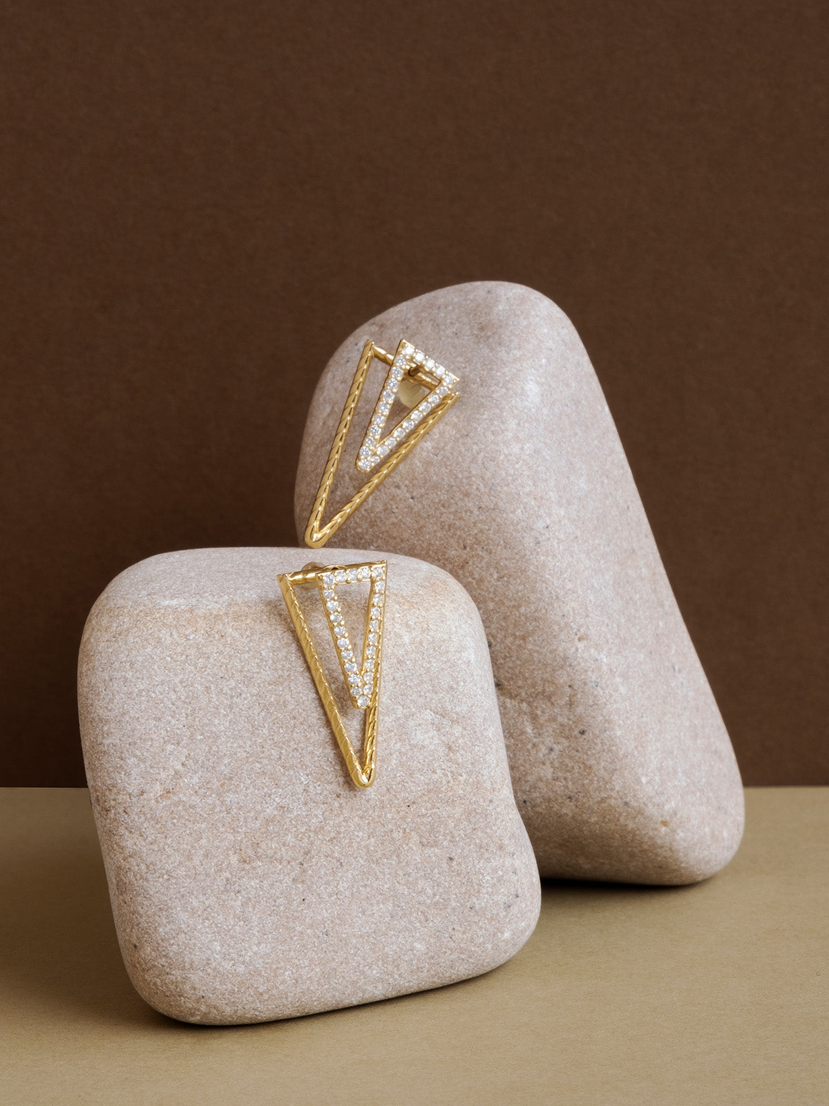 This elegant 14K gold earring features a striking triangular shape with a double-layered design adorned with prong set diamonds. It can be styled in 2-3 different ways. The geometric elegance and sparkling accents make it a perfect statement piece.