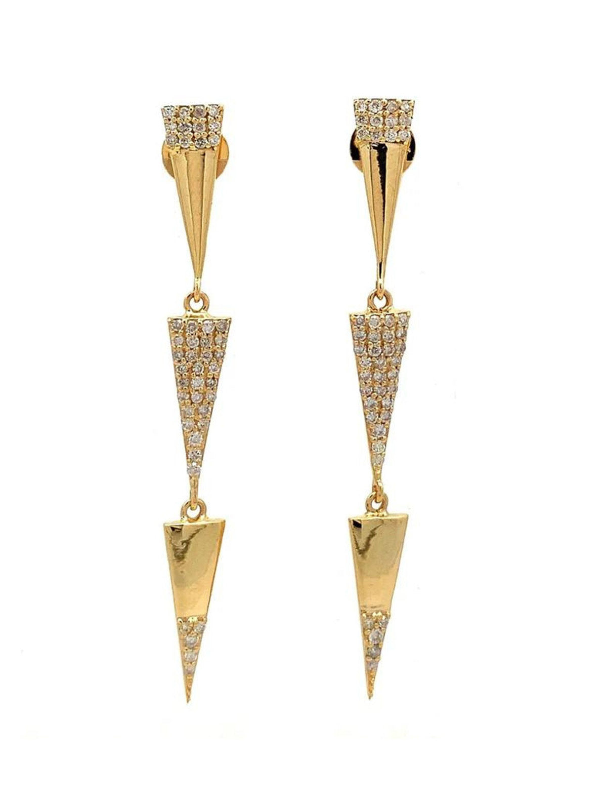These exquisite 14K earrings feature a striking design of alternating solid gold cones and pavé-set natural diamonds, creating a cascading effect. Perfect for both formal events and special occasions, they add a touch of sophistication and sparkle to any ensemble.