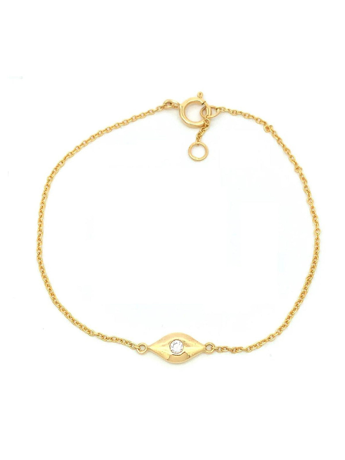 This exquisitely crafted bracelet features a tiny, yet powerful evil eye charm, meticulously shaped from 14k solid gold. A single, sparkling diamond twinkles in the center, symbolizing protection and clarity of purpose. The dainty chain adds a touch of understated elegance, making this bracelet perfect for everyday wear.