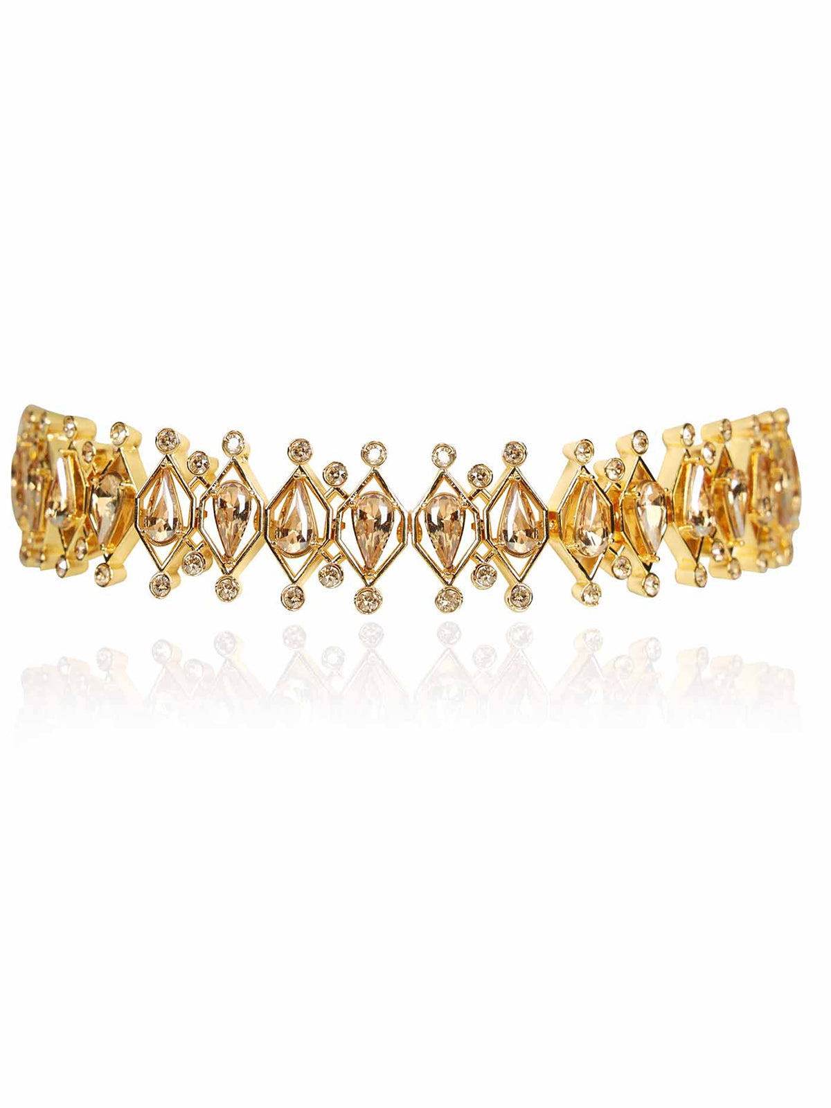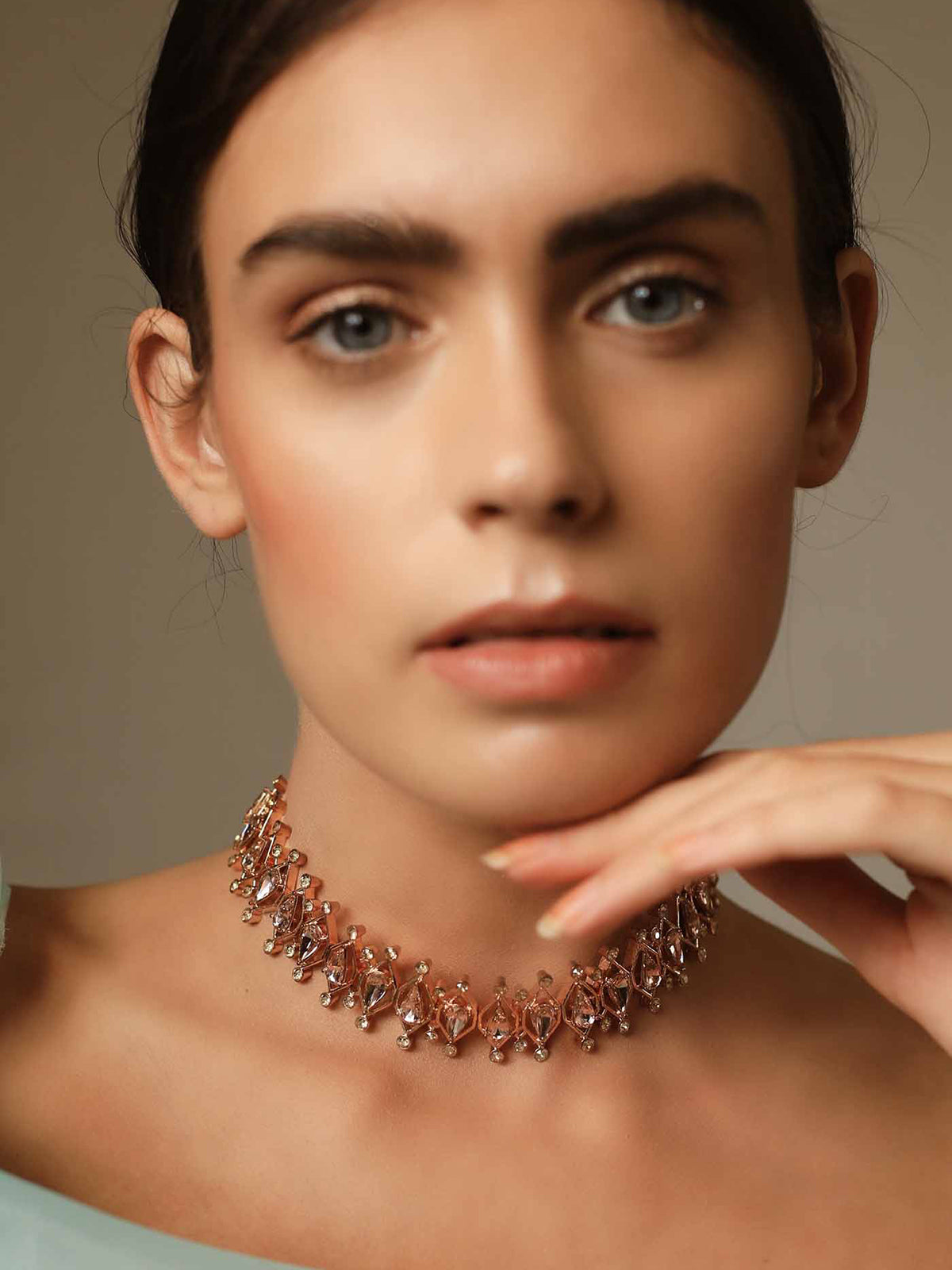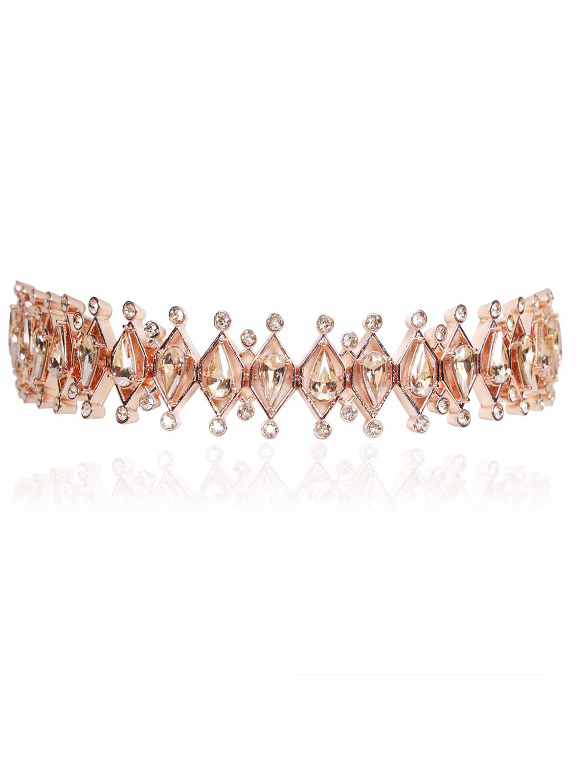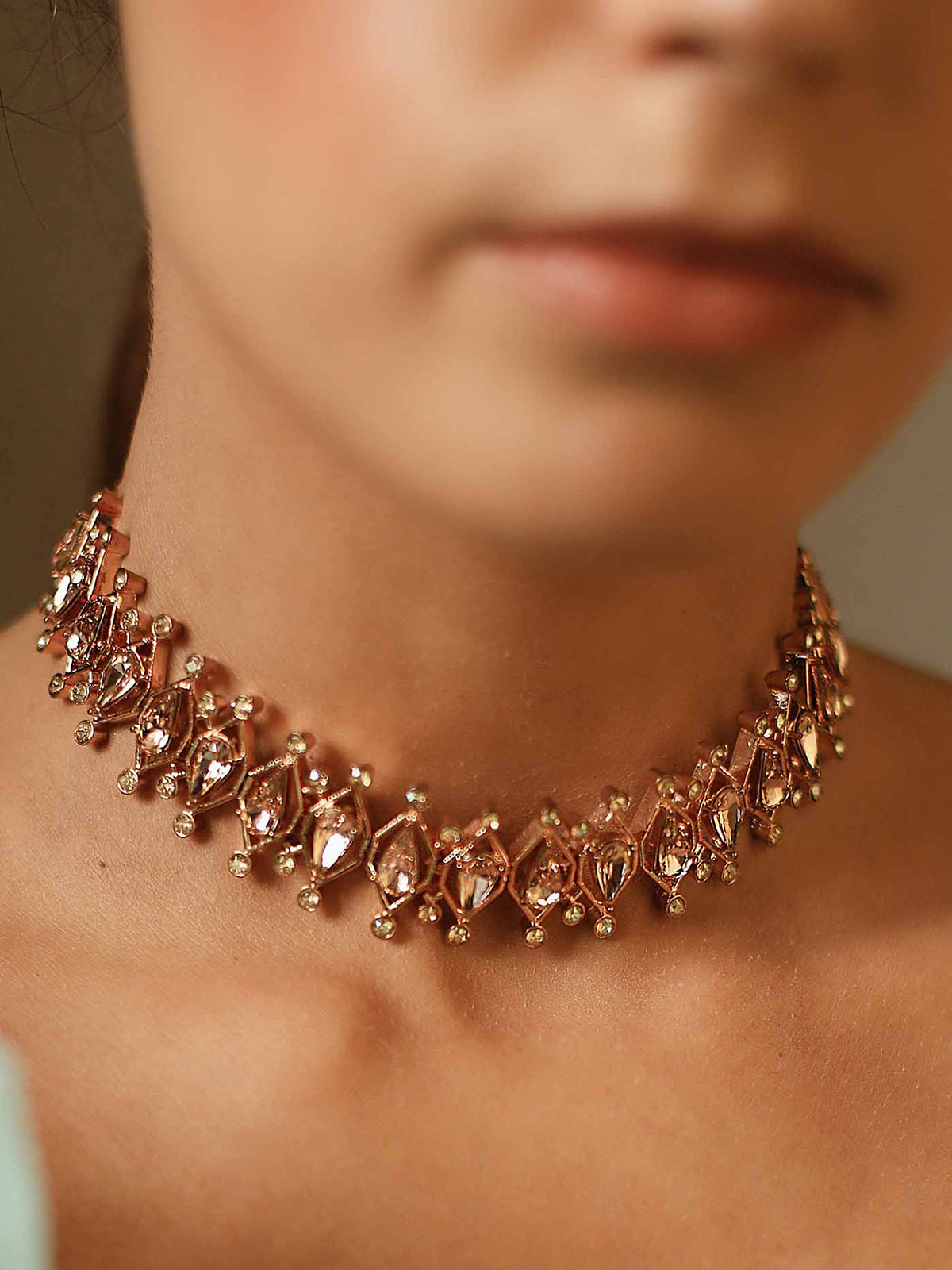 The soft tunes of the violin and memory of your last dance. This beautiful choker from our Rhythm collection is sculpted in a breathtaking cut work. It is bejewelled with fancy cut tear drop swarovski crystals that reflect light from every angle giving you that scintillating look.