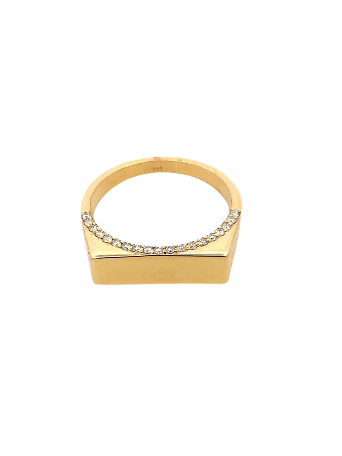 This Ring Features A Modern, Rectangular Design With A Sleek Flat Top Adorned With A Row Of Small Diamonds Paved On The Curve Of One Side. The Diamonds Are Set In A Line Across On The Other Side Of The Ring. This Makes The Ring Very Unique.