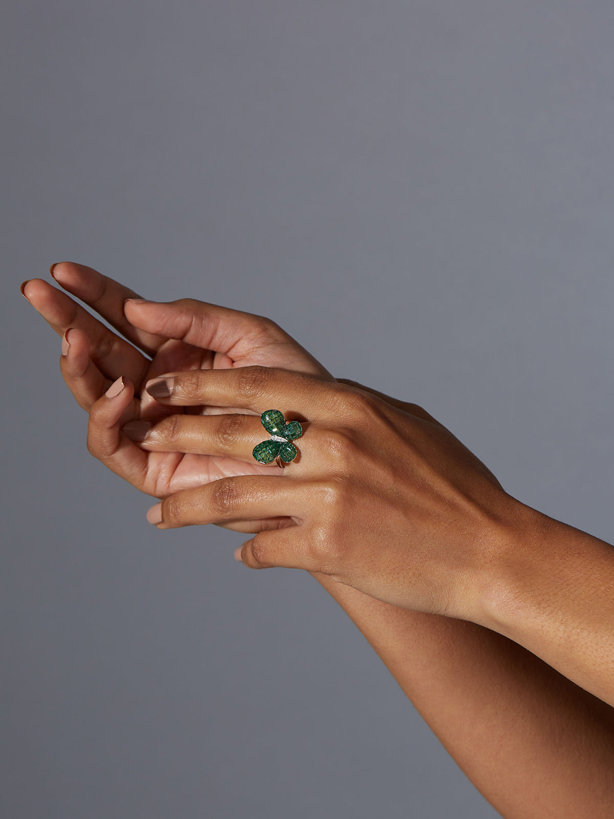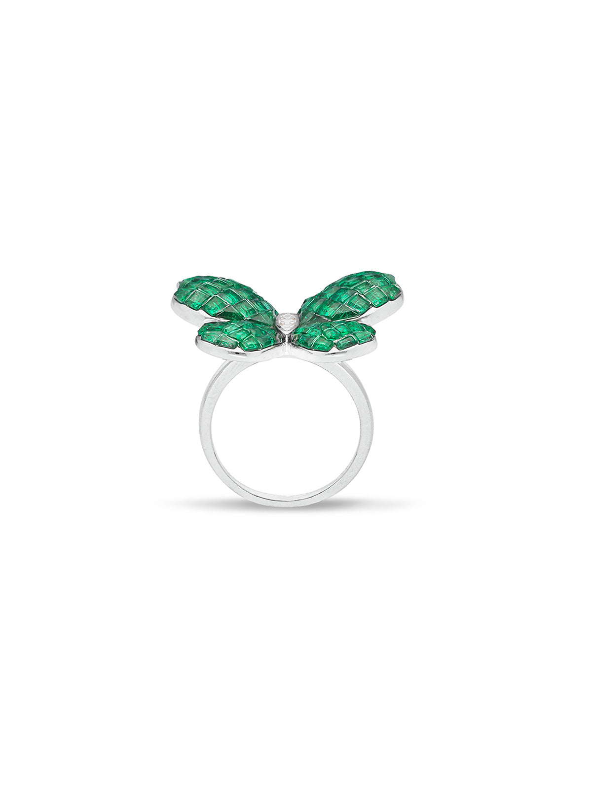 In this masterfully crafted statement statement ring, the wings of the butterfly are adorned with spinel stones that shimmer like dewdrops caught in the morning light, thus adding a touch of sparkle and elegance to this stunning piece which celebrates Nature in all her glory!