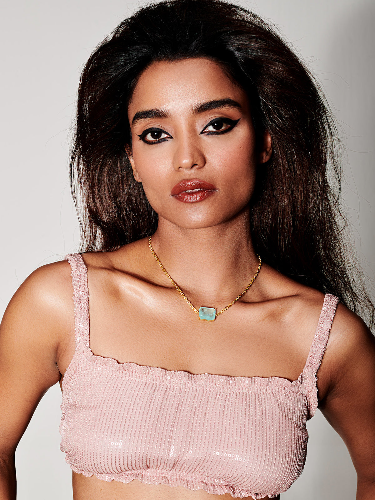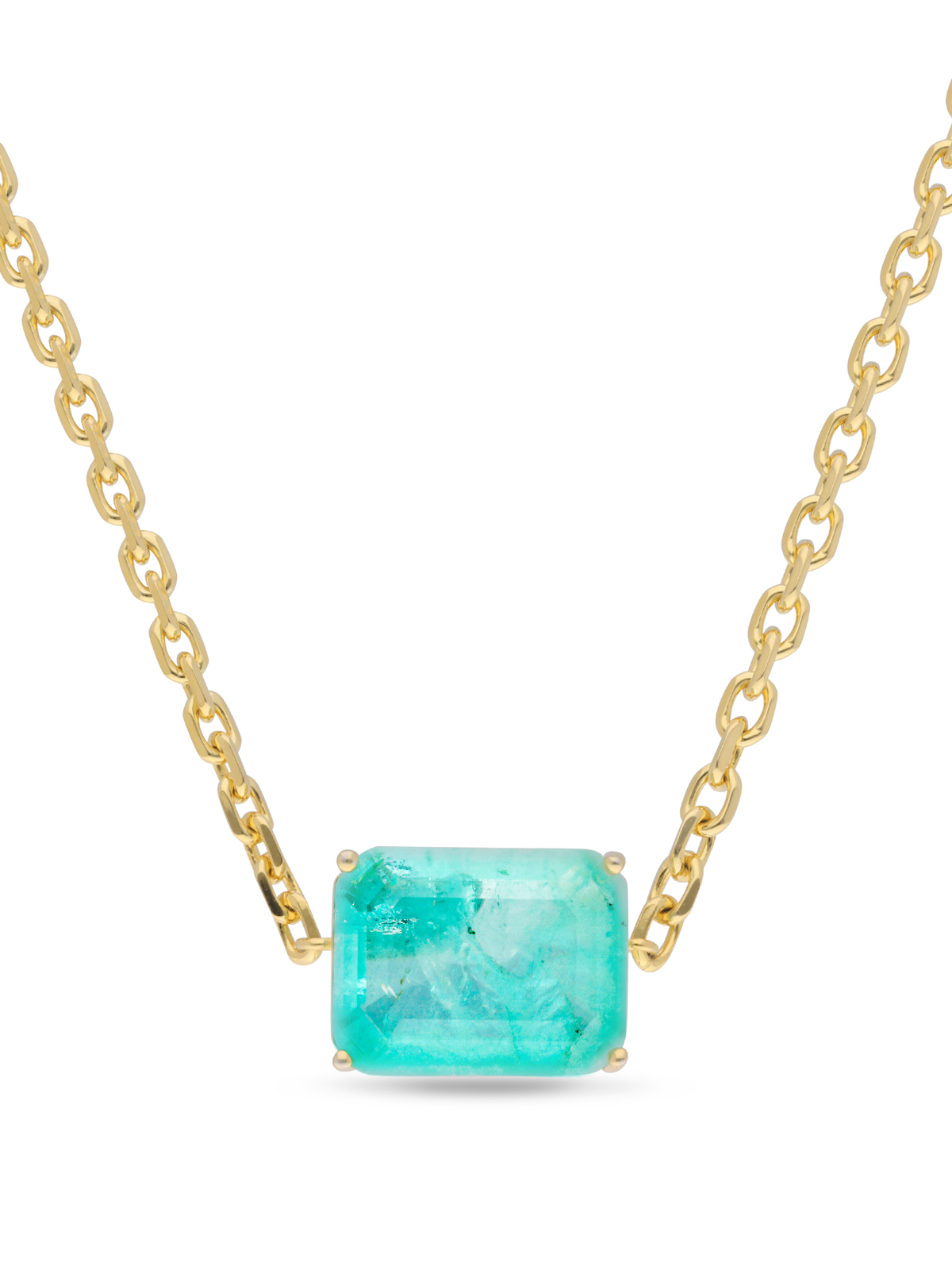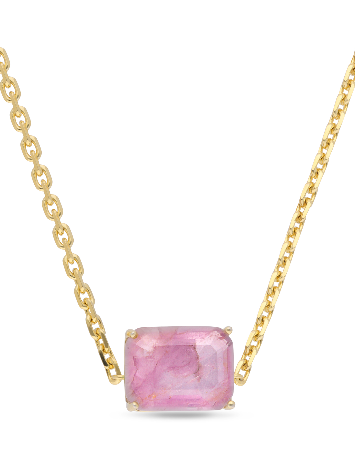 Add a touch of elegance to your look with this geometric pendant featuring a vibrant blue sapphire hued stone reminiscent of desert waters, accented with intricate metalwork and gold-plated sterling silver.
