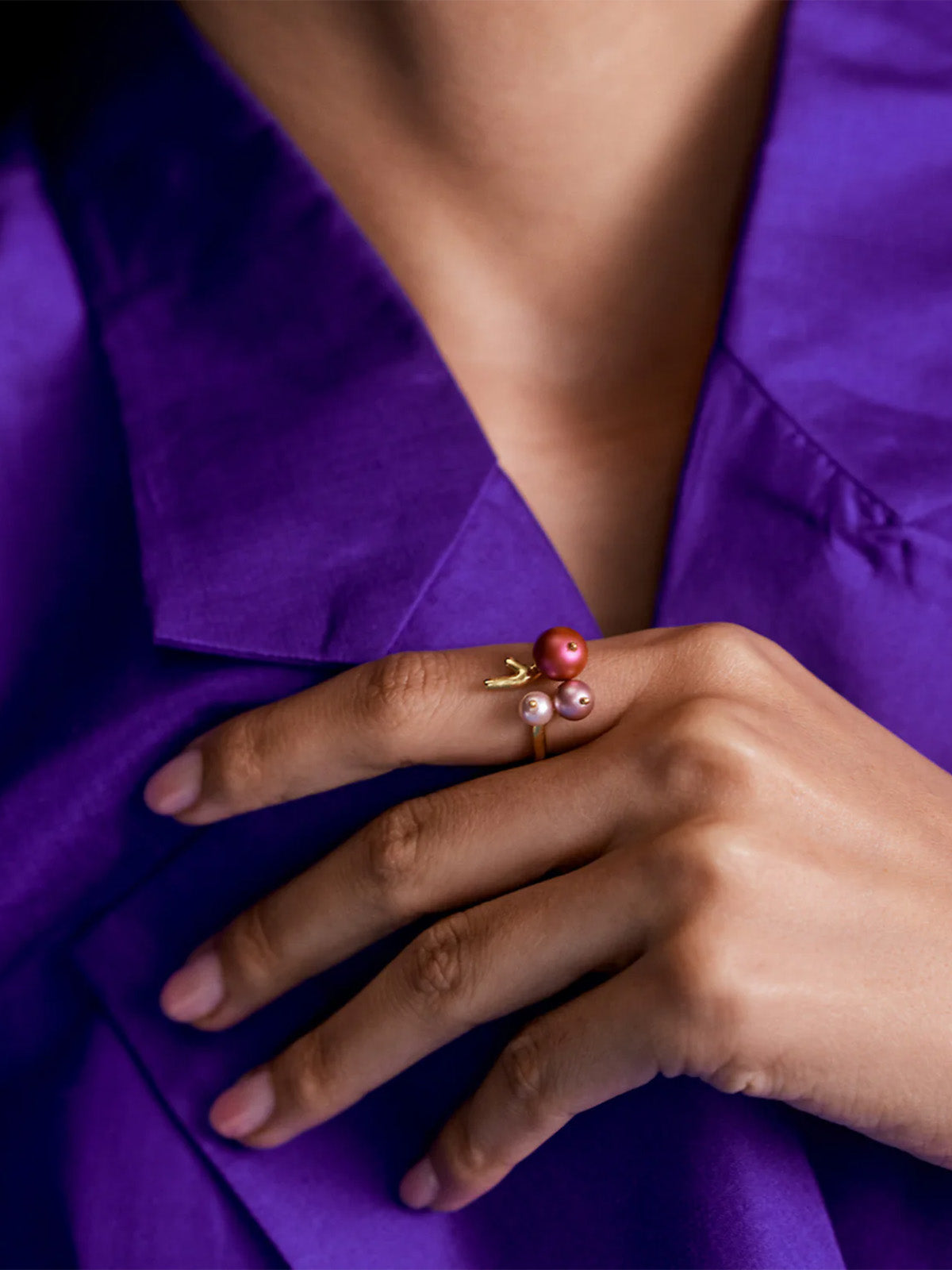 Rosée de café (meaning "Dew on Coffee") draws its inspiration from the coffee plantations in Coorg. It features glistening pearls and intricate gold designs abstracting the form of coffee berries. This collection is well suited for occasions demanding elaborate designs but where you don’t want to go with the commonplace!