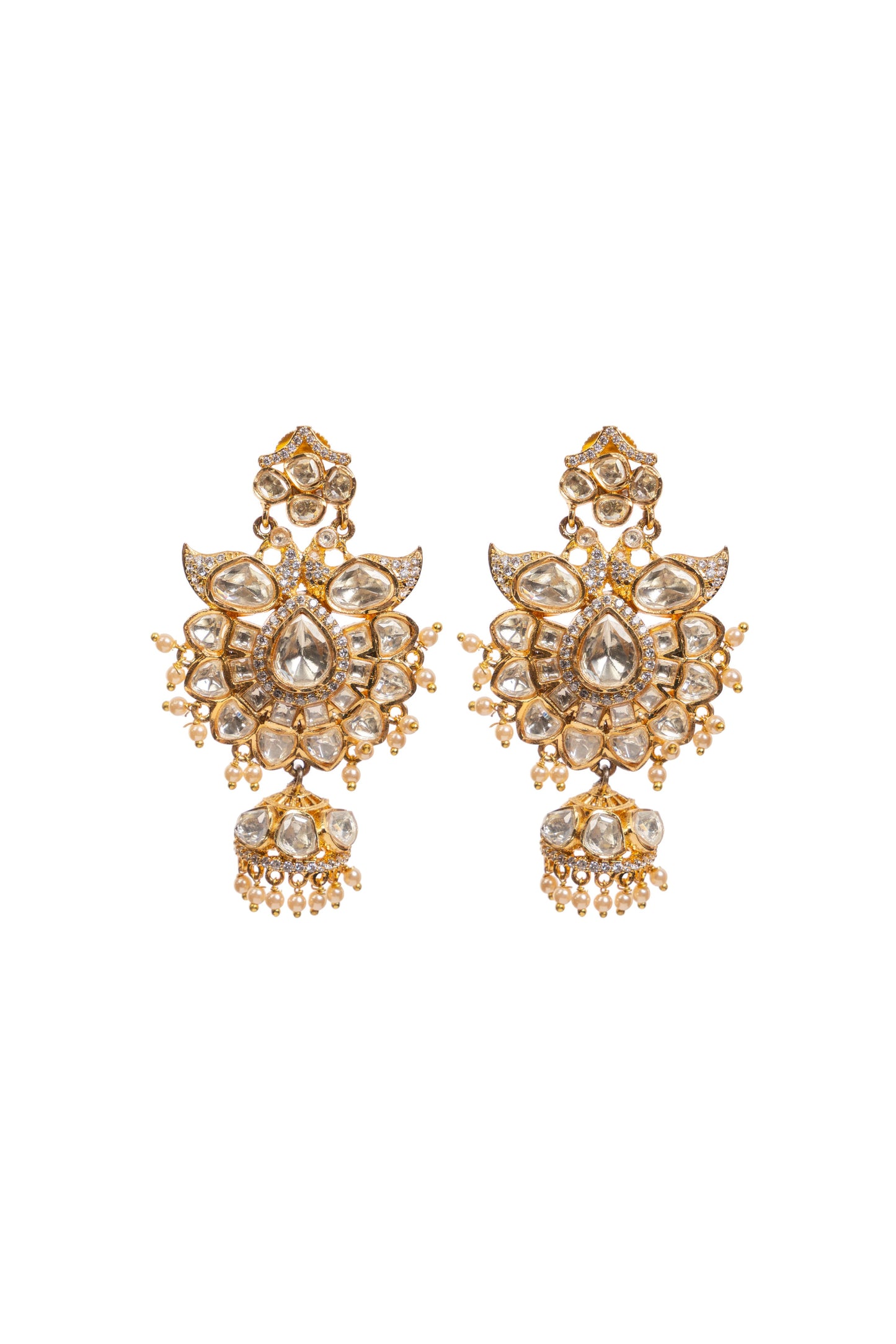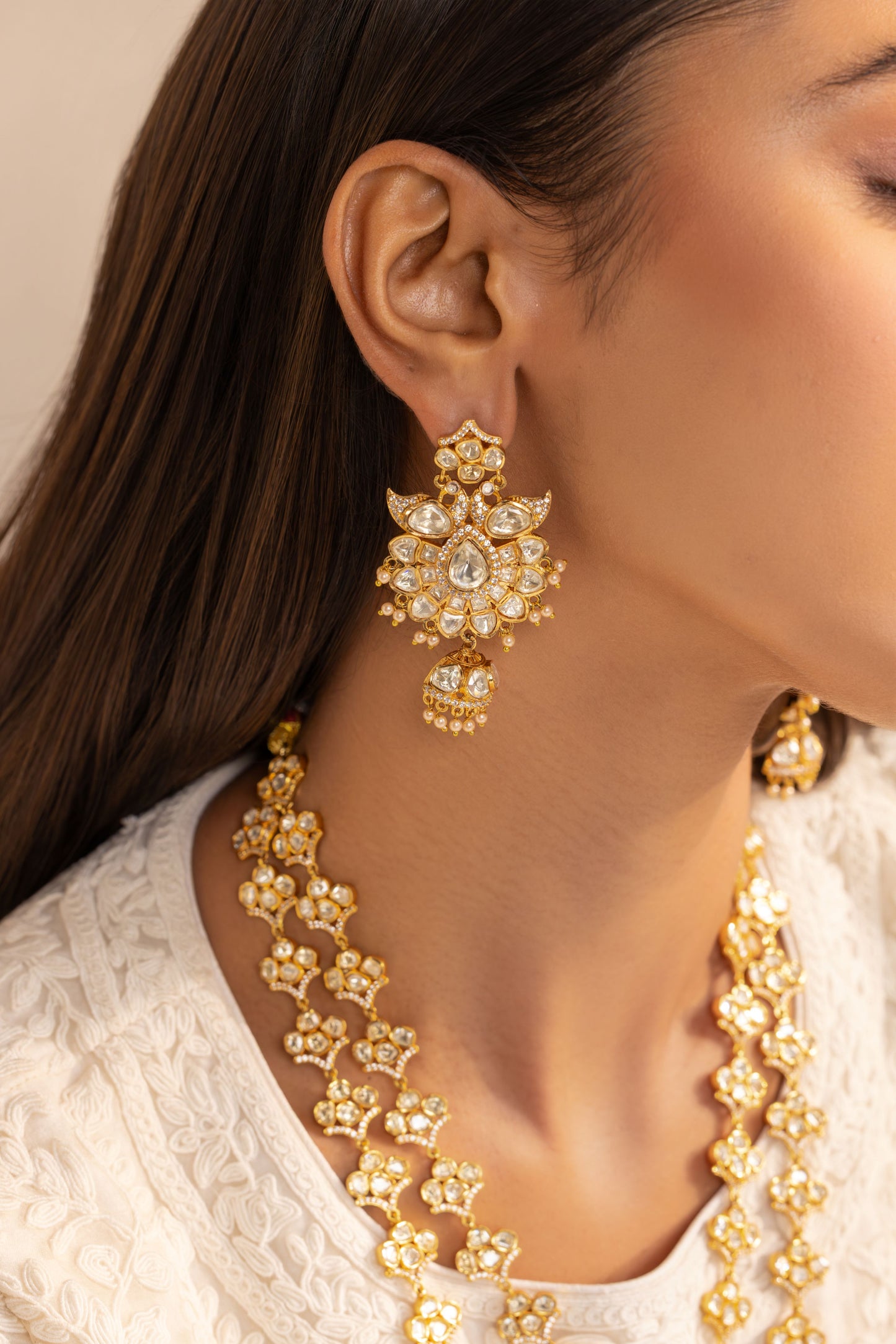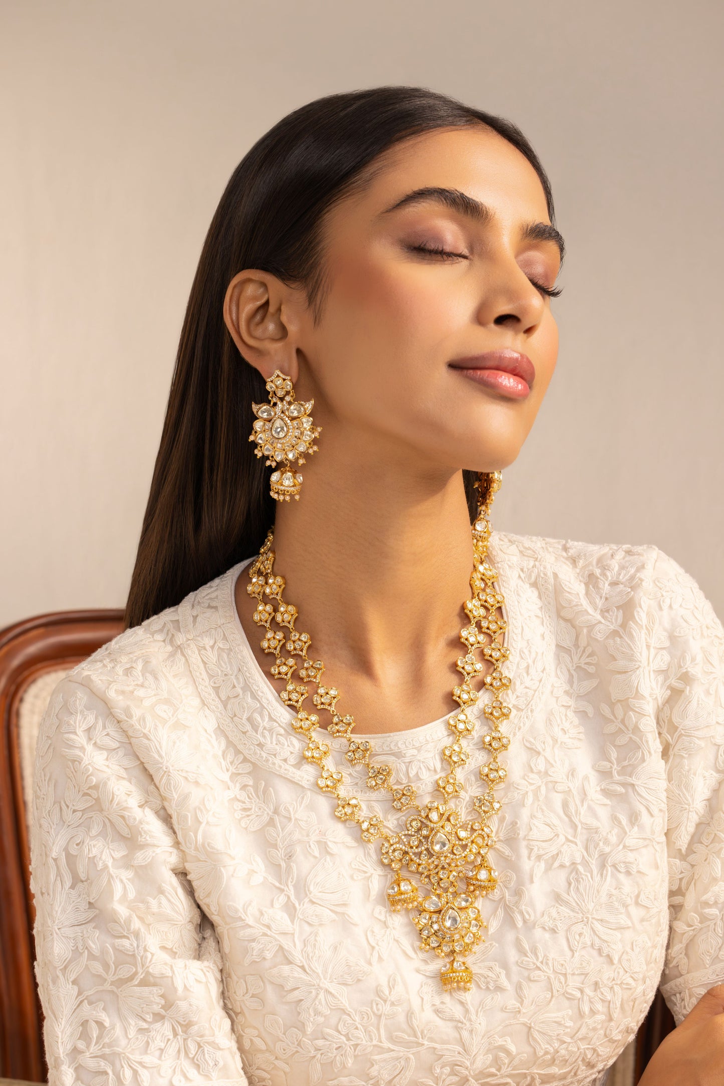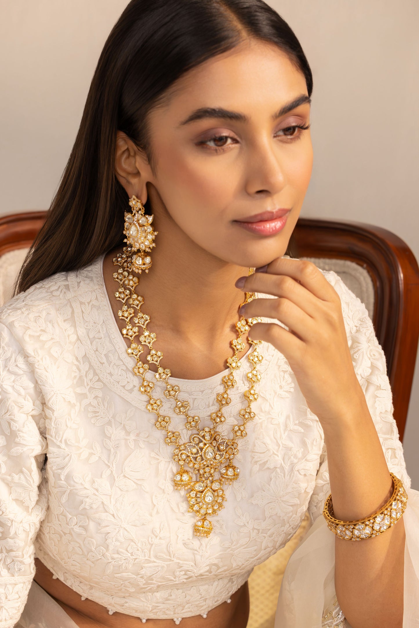 Graceful, ornate, and steeped in heritage — The Nityara Necklace Set glows with divine luminosity. Handcrafted in a warm copper-brass alloy, its cascading floral motifs shimmer with Moissanite brilliance, outlined in delicate Zirconia halos. Inspired by temple artistry yet made for modern celebrations, this long necklace evokes the grandeur of heirloom jewels — a piece that feels eternal, radiant, and royally feminine.