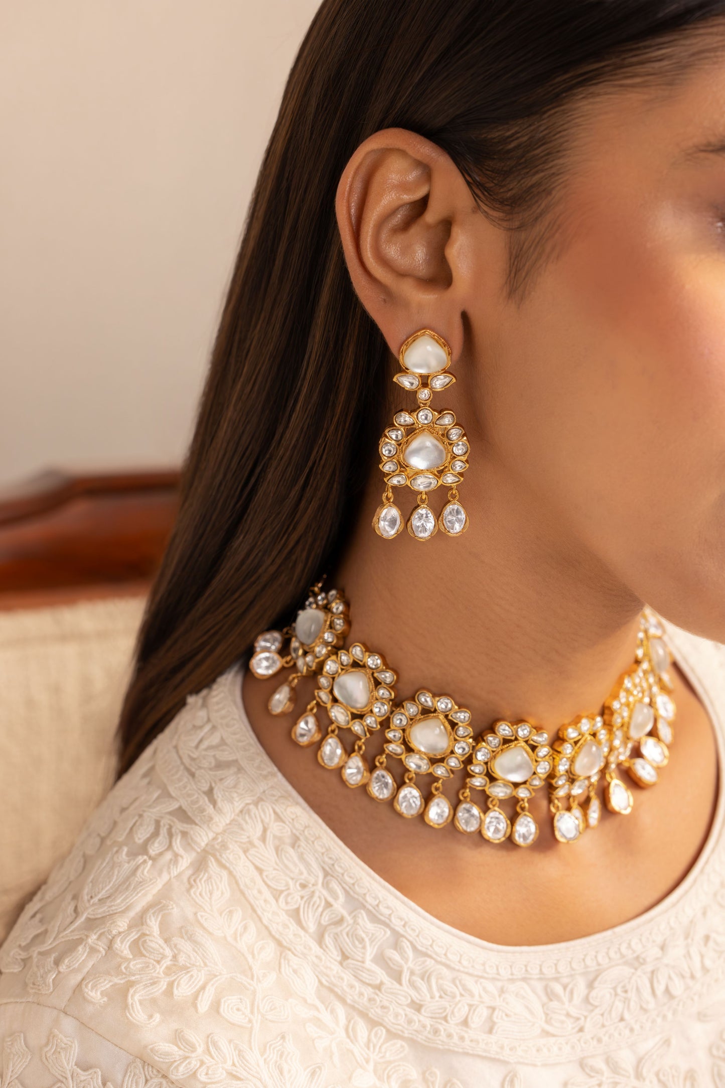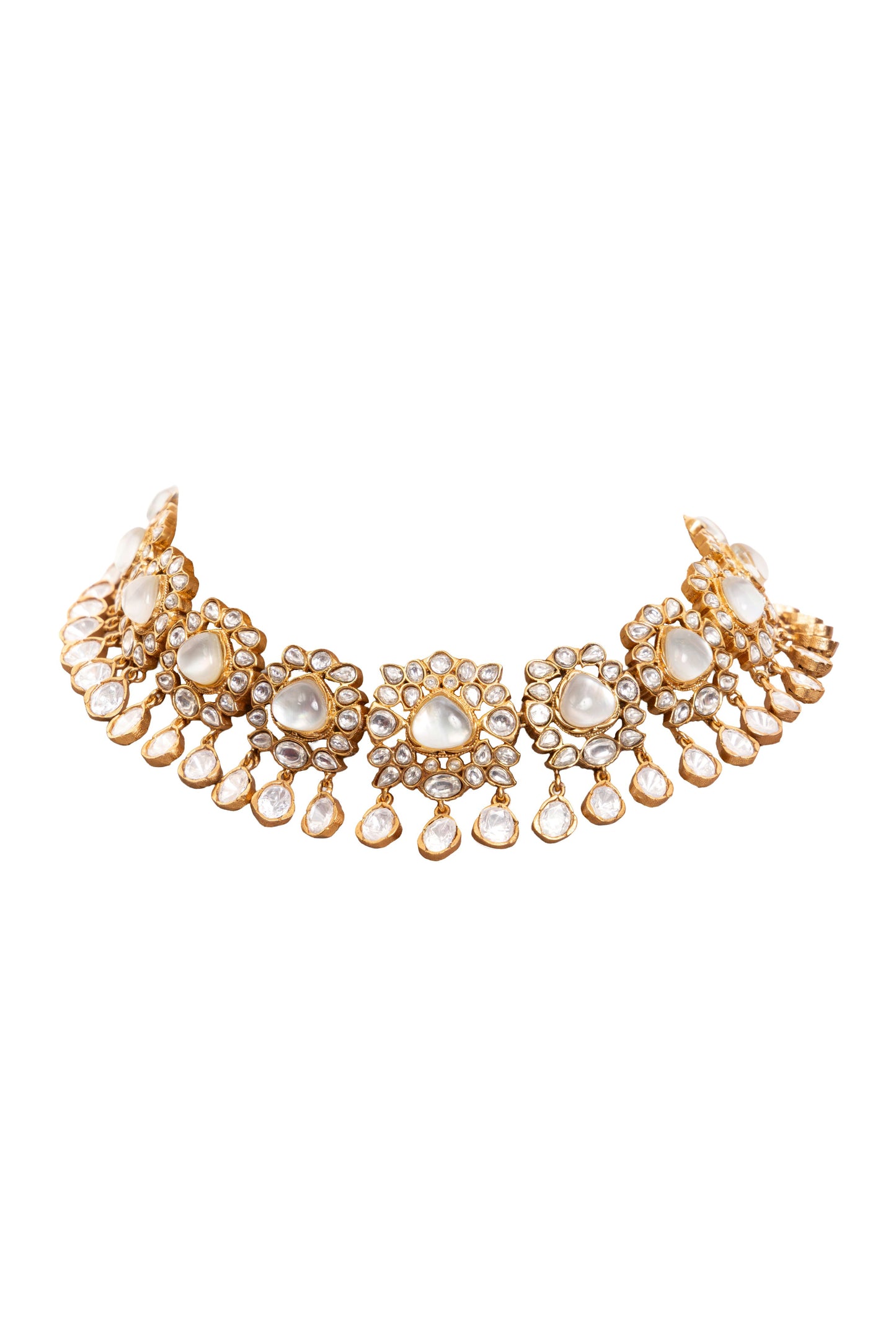Soft as moonlight, The Noor-e-Moti Choker captures the glow of tradition with a touch of serene modernity. Each petal-shaped Mother of Pearl is encircled with hand-set Polki, creating a gentle rhythm of shimmer and sophistication. Crafted in a warm copper-brass alloy, this piece celebrates quiet grandeur — perfect for the bride who loves timeless elegance wrapped in subtle luminosity.